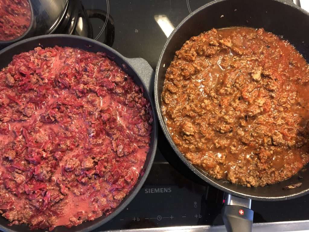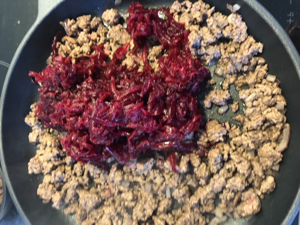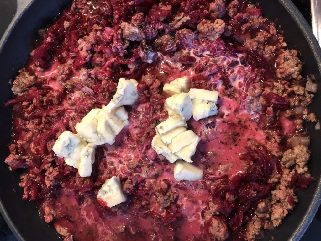 Kuulota sipulia oliiviöljyssä. Lisää jauheliha pannulle, paista kypsäksi. Mausta mustapippurilla. Älä lisää suolaa, homejuustossa ja lihaliemessä on sitä jo tarpeeksi. Lisää raastettu punajuuri pannulle. Sekoita.