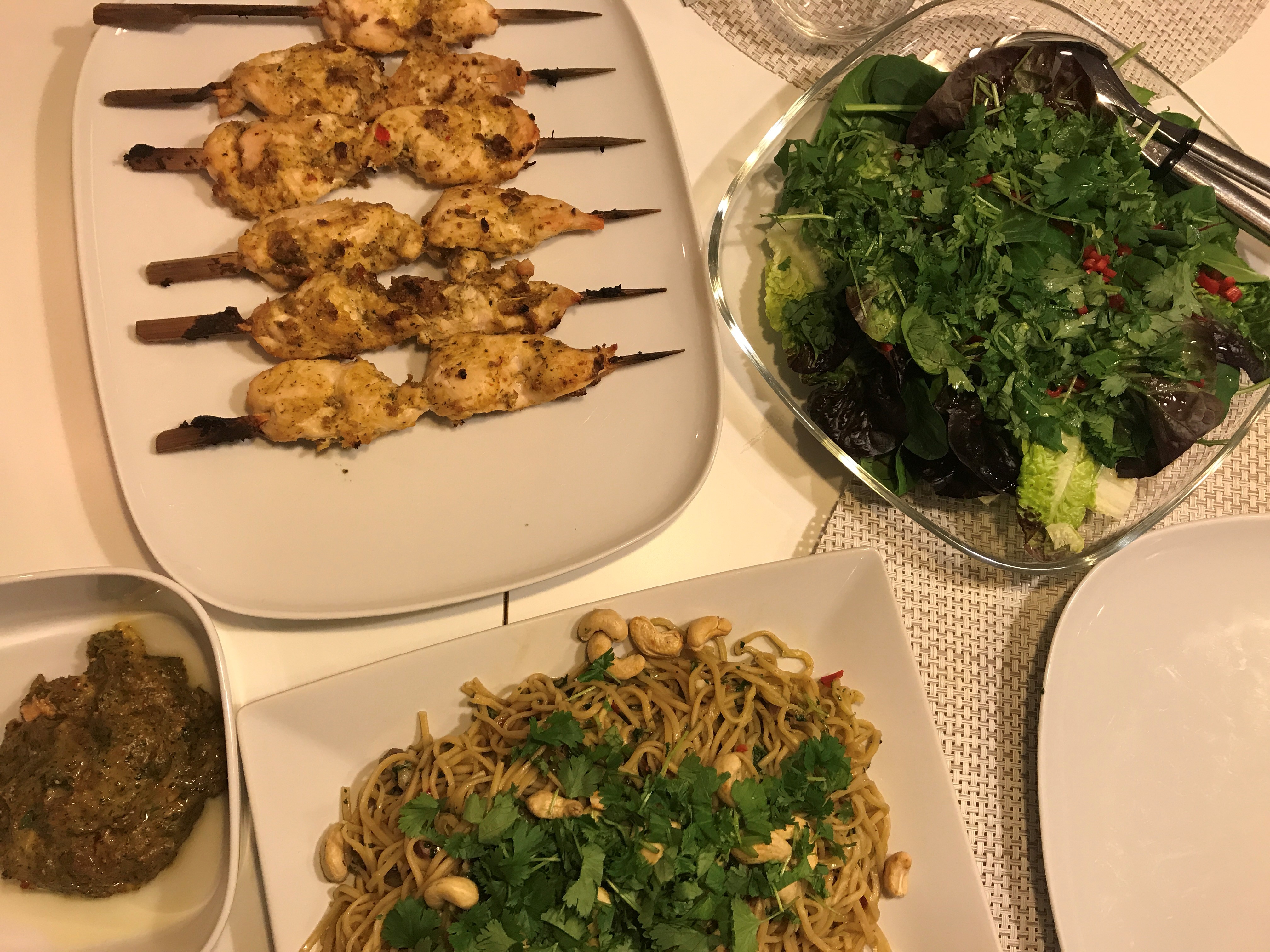 Ennen kuin laitat Satay-vartaat uuniin, tee salaatti valmiiksi ja nuudelit melkein valmiiksi.