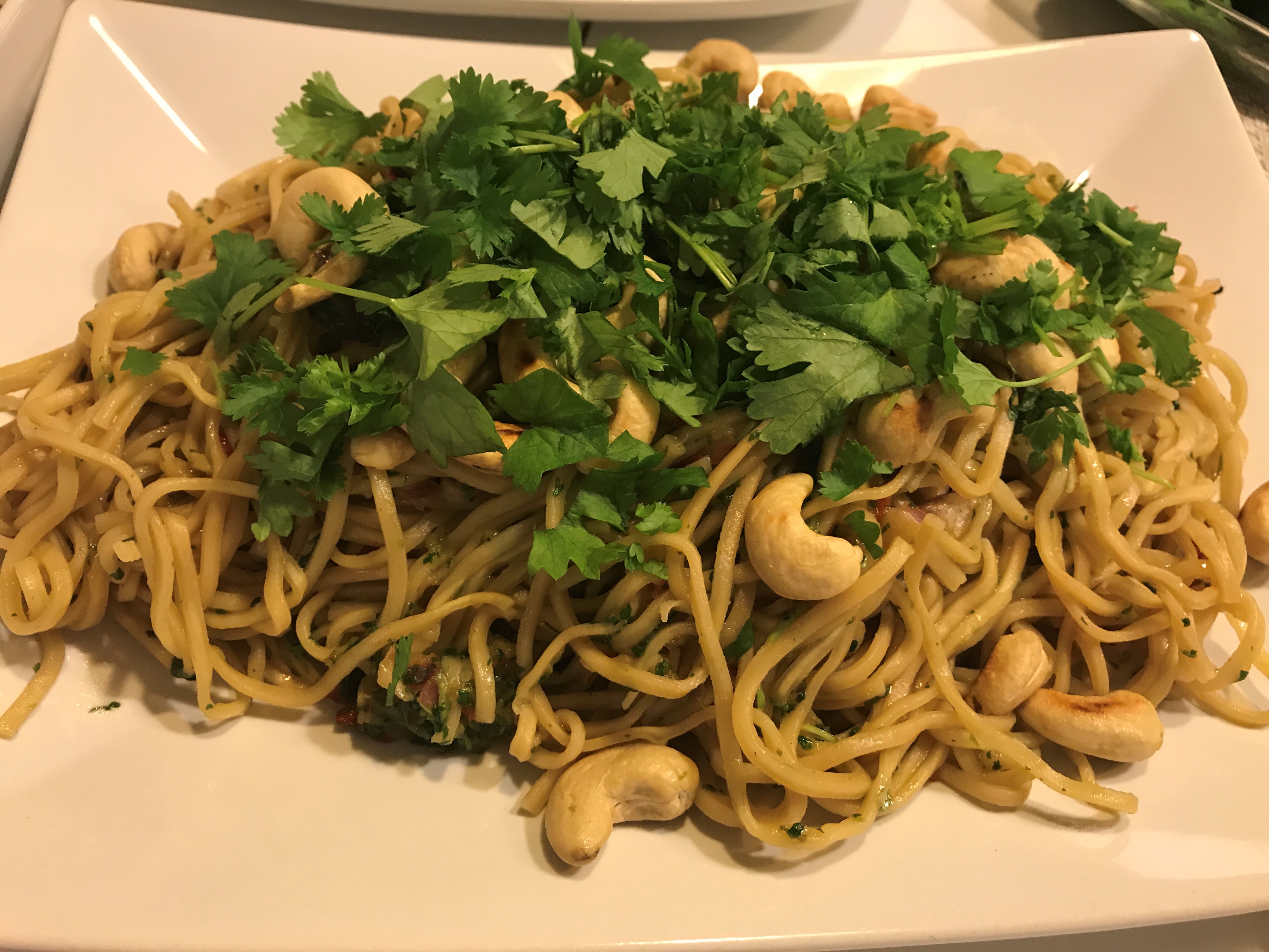 Paahda cashew pähkinöitä kuivalla pannulla, niin että niihin tulee kaunis väri. Ole tarkkana, äläkä jätä pähkinöitä yksin, paahtuminen tapahtuu lopuksi nopeasti. Tee kastike. Laita astiaan puolet korianterista, pilkottu chili, pilkottu punasipuli, soija, seesaminöljy, kalakastike, soija ja hunaja. Soseuta sauvasekoittimella kastike tasaiseksi.Lisää muutama loraus oliiviöljyä ja sekoita. Keitä nuudelit ohjeen mukaan. Laita kypsät nuudelit isoon astiaan ja kaada kastike päälle, sekoita tasaiseksi. Laita nuudelit tarjoiluastiaan, koristele pähkinöillä ja silputulla korianterilla.