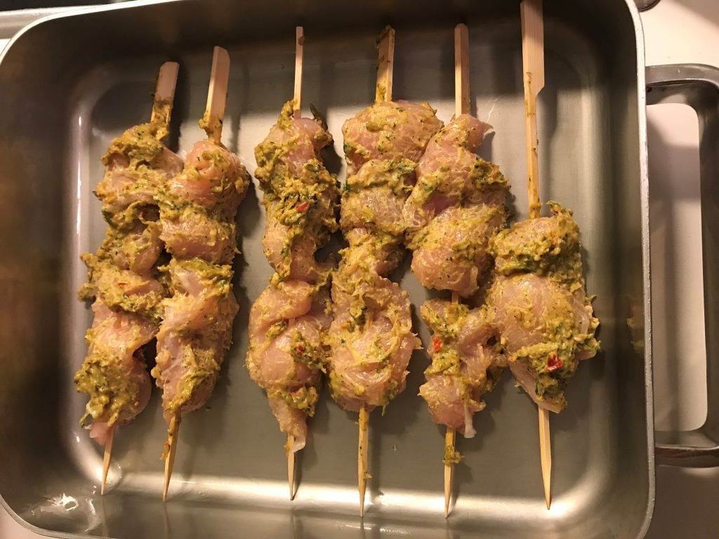 Leikkaa fileet suupaloiksi, pyörittele broilerit jäljelle jääneessä sataysoseessa ja asettele vartaisiin. Valuta vartaiden päälle hieman oliiviöljyä ja ripottele päälle suolaa. Paista fileet grillivastusten alla 220C 8-10 minuuttia ja käännä ainakin kerran. Tarkista kypsyys halkaisemalla yksi suupala.