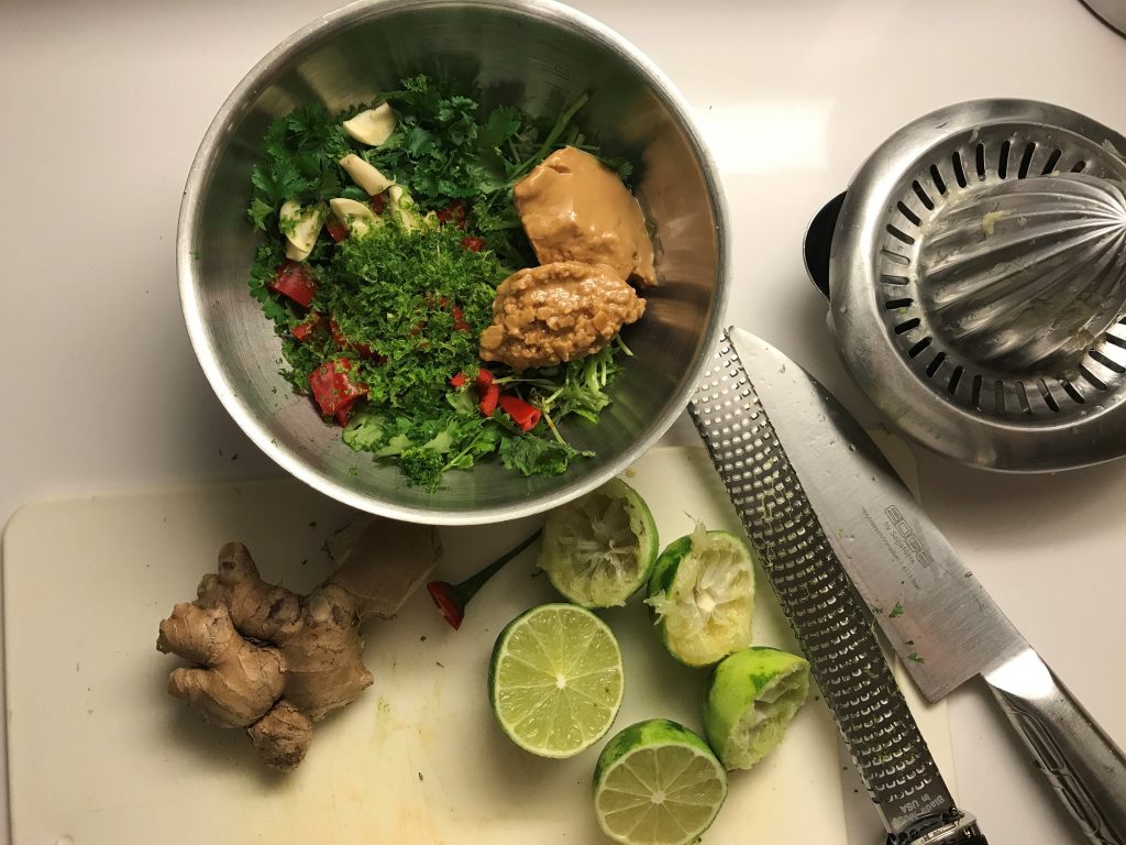 Laita monitoimikoneeseen tai astiaan ja käytä sauvasekoitinta soseuttamiseen kaikki satayn ainekset broileria lukuun ottamatta. Silpu korianteri pienemmäksi, poista chilistä kanta ja siemenet ja pilko veitsellä hieman pienemmäksi. Kuori ja pienennä inkivääri. Raasta molempien limen kuori ja purista mehut. Kun kaikki ainekset ovat astiassa lisää muutama tilkka vettä ja aja tasaiseksi soseeksi. Laita puolet sataysta tarjoilu astiaan ja valuta päälle halutessasi hieman hyvää oliiviöljyä ja jätä odottamaan ruuan valmistumista.