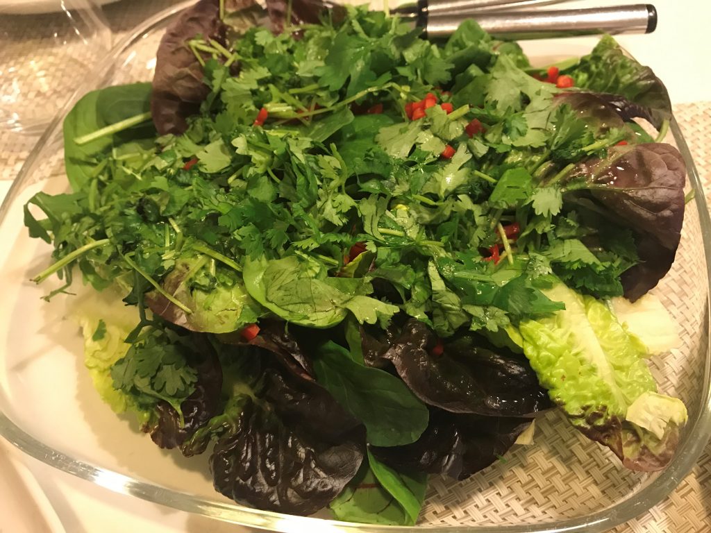 Pese sydänsalaatit ja irrota lehdet ja asettele tarjoiluastialle muiden salaattien kanssa. Silpu chili pieneksi ja asettele sydänsaalaatin päälle yhdessä silputun korianterin kanssa. Sekoita puristettu limen mehu ja soija ja kaada salaatin päälle.