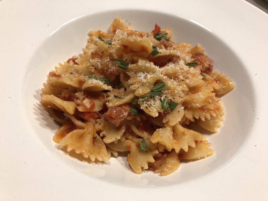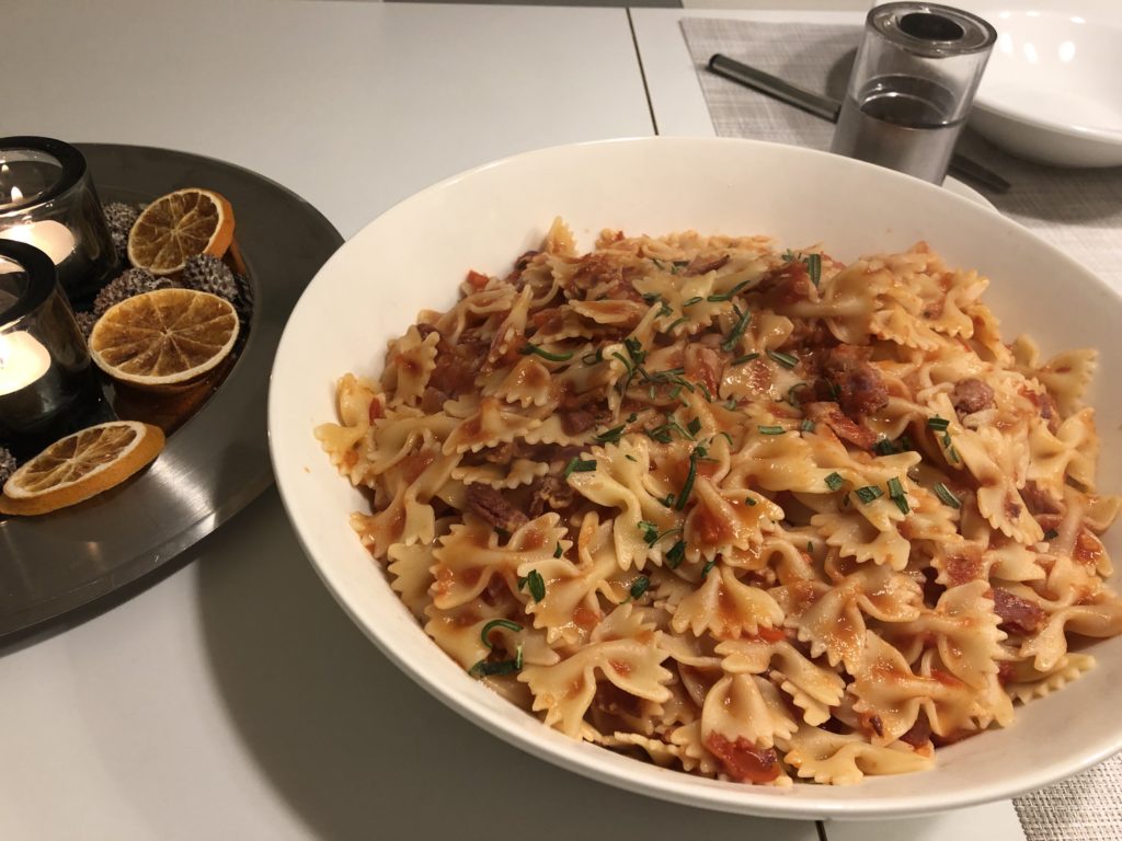 Pastana voit käyttää mitä tahansa pastaa, kunhan pinta on sellainen, että siihen tarttuu hyvin tomaattikastike. Meillä oli tällä kertaa farfallea. Fusilli toimisi myös hyvin sekä penne, jossa on raitaa.