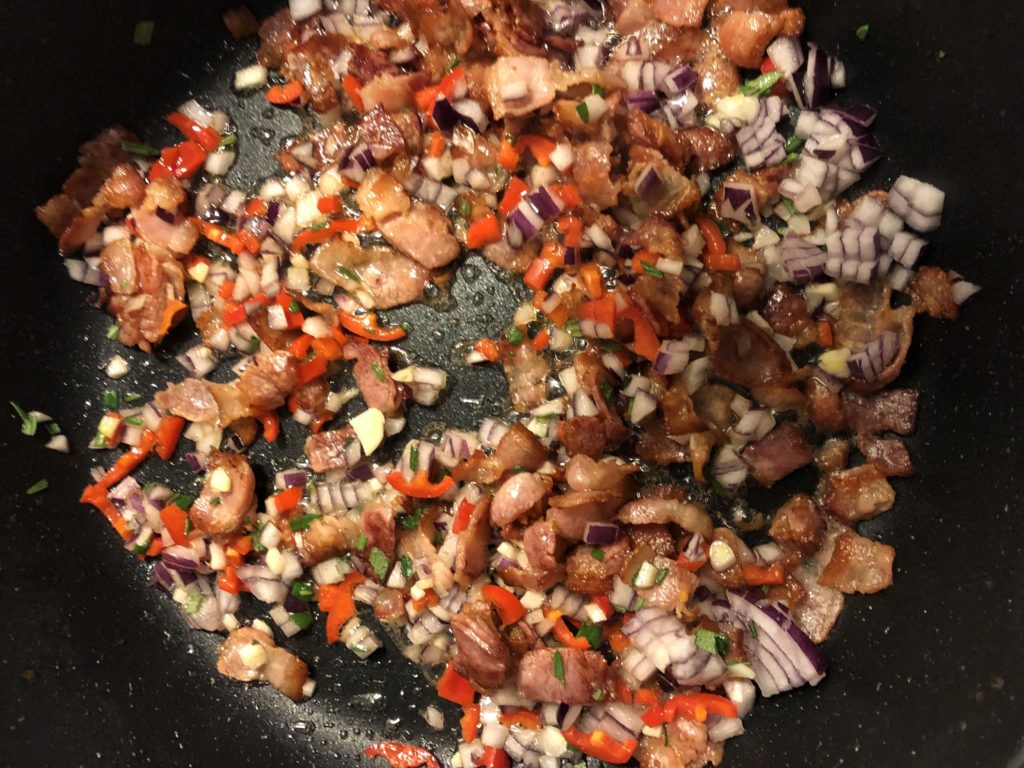 Suikaloi pekoni. Silppua sipulit ja chili sekä rosmariini. Laita oliiviöljy pannulle tai paista ilman sitä pekoni rapeaksi. Lisää loppupuolella sipulit, chili sekä rosmariini. Sekoita ja anna sipulien kuullottua.