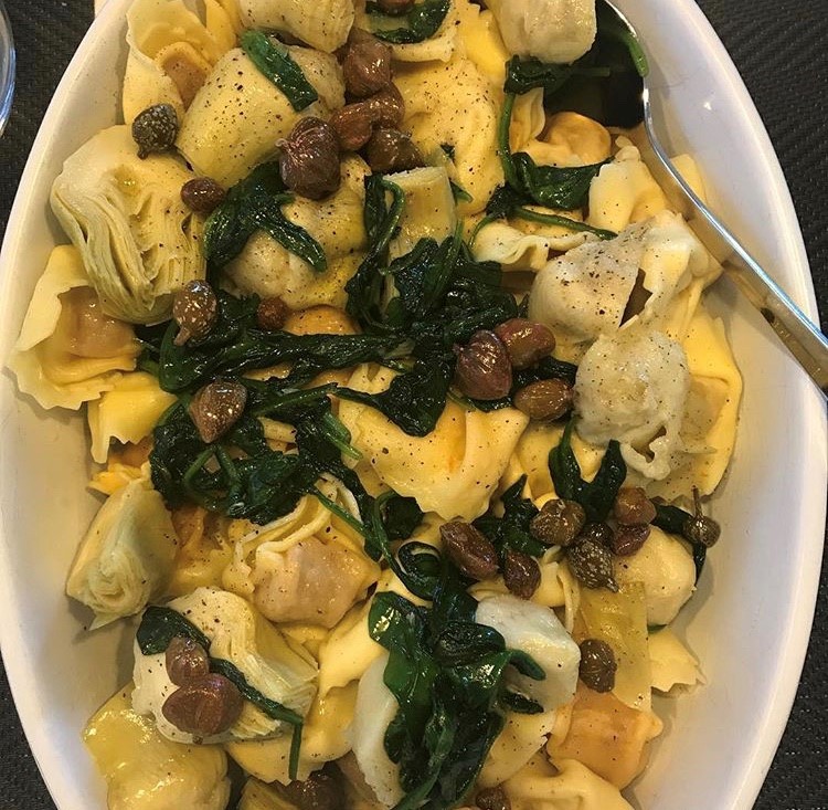 Maa-artisokkakeitto ei pojillemme maistunut, kuten kerroin, mutta tämä artisokka-ravioli kuitenkin maistui, ainakin isommalle. Pinaatti on kasvis, jota tulee harvemmin käytettyä ja tätä tehtyäni mietin miksi. Hyvää on ja toimi tässä ruuassa muiden makujen kanssa hyvin. Raviolin sijaan tein ruuan tortelloneista, koska niitä sattui jääkaapissa valmiina olemaan. Ravioli tai tortelloni, kumpi tahansa täytetty pasta sopii ja mikä täyte vain itselle parhaiten maistuu. Itse käytin tällä kertaa juusto aurinkokuivattu tomaatti tortellinoja. Kun raaka-aineita on vähän keskityn laatuun. Annokseen tulee myös kapriksia. Näitä toki saa mistä tahansa lähikaupasta, mutta koska niiden maku tulee vahvasti esiin raaka-aineiden vähyydestä johtuen, käytin annokseen Maltalta viime kesänä tuomiamme maltalaisia kapriksia. Tuon aina ulkomaanmatkoilta paikallisia ruokia, mausteita, öljyjä ja muuta, jotka aina ruuanlaiton yhteydessä muistuttavan matkoista ja tuovat hyvälle mielelle. Yksi raaka-aine on myös voi ja nimenomaan voi, sitä ei voi korvata öljyllä, määrä on kuitenkin maltillinen. Tämän ohjeen löysin Maku lehdestä. Neljän hengen perheellemme tein annoksen tuplana.