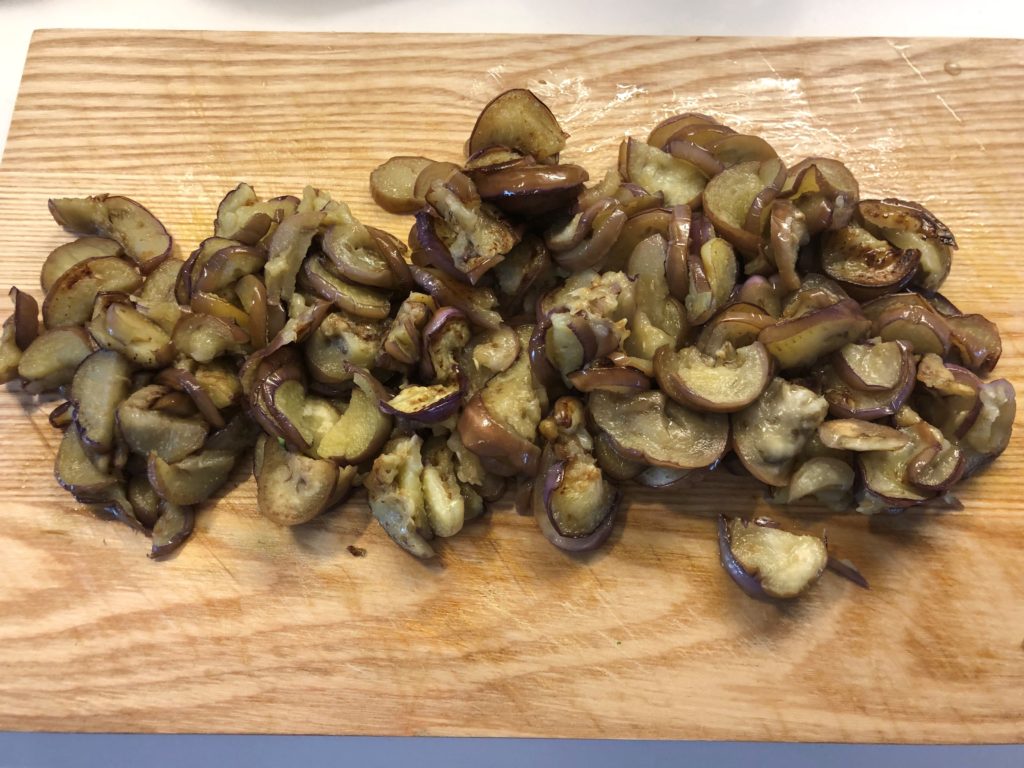 Silppua paistetut munakoisot pienemmiksi ja lisää kastikkeen joukkoon.