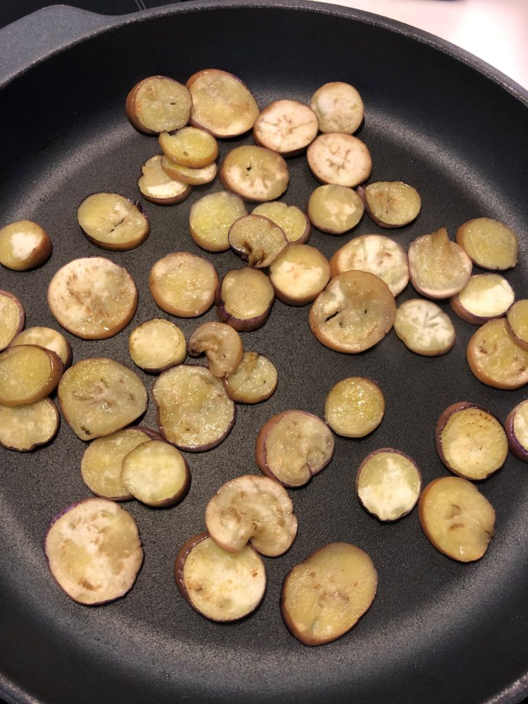 Jätä kastike hautumaan ja taputtele munakoisot kuivaksi keittiöpyyhkeellä. Paista viipaleet erissä toisessa pannussa kauniin ruskeiksi melko runsaassa oliiviöljyssä. Nosta paistetut munakoisot talouspaperilla vuoratun lautasen päälle, jotta ylimääräinen öljy imeytyy talouspaperiin.