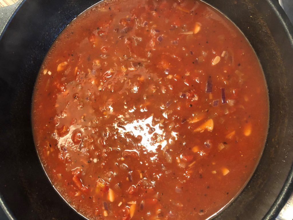Valmista tomaattikastike. Kuori ja hienonna sipulit. Kuullota ensin sipulia oliiviöljyssä, lisää hetken kuluttua valkosipuli ja kuullota ne myös, älä ruskista. Lisää tomaattimurska pannulle. Mittaa vesi tomaattimurska purkkiin ja pyöräytä veden avulla myös loppu murska pannuun. Lisää myös punaviini. Mausta kastike.