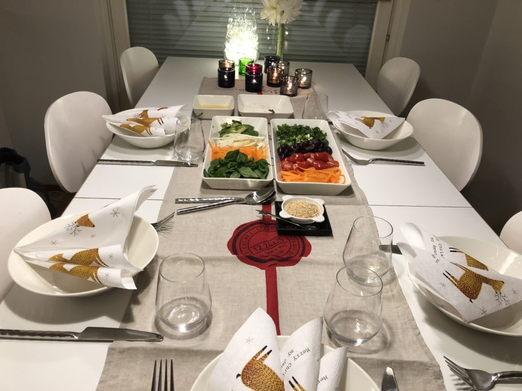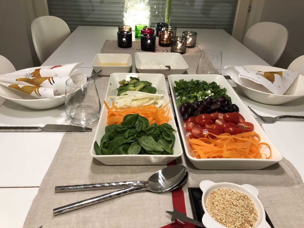 Ennen joulua kutsun poikien kummeja käymään meillä ja tapaamaan poikia ja vaihtamaan kuulumisia, sekä myös tietysti vaihtamaan paketteja. Maanantaina työpäivän päätteeksi oli taas vierailun vuoro. Tein ruuaksi kvinoa-kanabowlia, jossa kaikki ainekset tarjotaan erikseen ja näin jokainen voi taas koota oman näköisen annoksen. Tässä ohjeessa on erittäin hyvä kastike kanalle ja se on ehdottomasti yksi kuopuksen suosikeista ja hän oli pyytänyt jo jonkin aikaa, että tekisin taas tätä ruokaa. Ennen ruokailua hän muistutti, että olinhan valmistanut kanaa tarpeeksi, koska hän tulee syömään niitä niin paljon! Kanan lisäksi lisukkeina oli porkkanaa, fenkolia, viinirypäleitä, kirsikkatomaatteja, kevätsipulia, lehtipersiljaa, avocadoa, seesaminsiemeniä, paistettua kananmunaa sekä tahinilla maustettua turkkilaista jogurttia. Kvinoa oli päässyt loppumaan ja tällä kertaa tarjolla oli couscousia, jonka keitin kasvisliemessä. Ohje on jo täällä blogissa.
