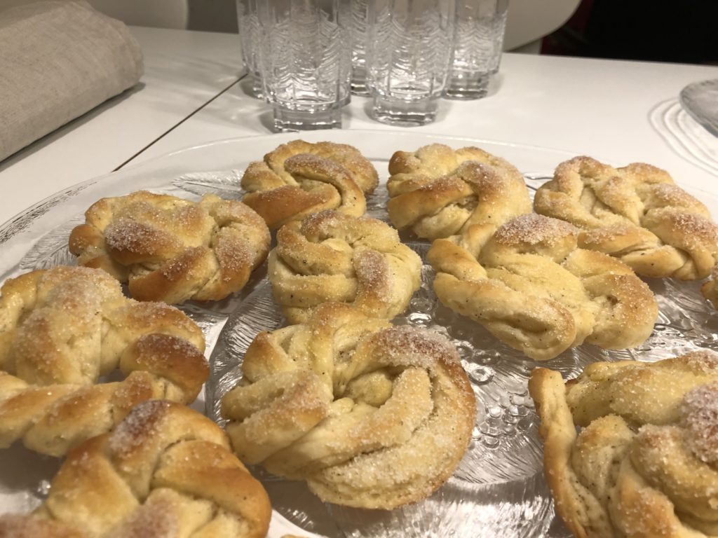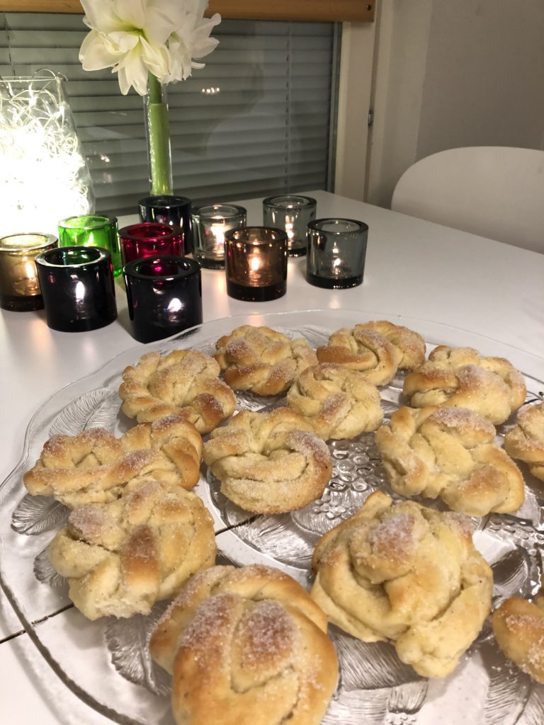 Jälkiruuaksi tein kristallipullia. Itse asiassa teimme pullat yhdessä, olin vain tehnyt taikinan valmiiksi. Yhdessä tekeminen on kaikkein parasta. Nämä kristallipullat tein Valion ohjeella. Niissä on runsaasti vaniljasokeria ja ne olivat ihan hitti, maistuivat todella hyviltä! Niitä valmistui paljon ja koska ne ovat parhaimmillaan samana päivänä, vein muutaman pullan myös naapuriin.