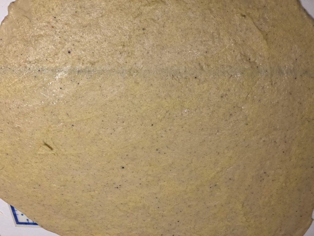 Kaada taikina jauhoitetulle pöydälle ja vaivaa hyvin. Kauli tämän jälkeen taikinasta tasaisen levy, noin 65 x 35 cm. Sekoita huoneenlämpöinen voi sokerien kanssa tasaiseksi seokseksi kulhossa, lisää myös tilkka maitoa notkistamaan täytettä. Kun seos on valmis levitä se ohuelti taikinalevylle. Tämä käy helpoiten veitsellä.