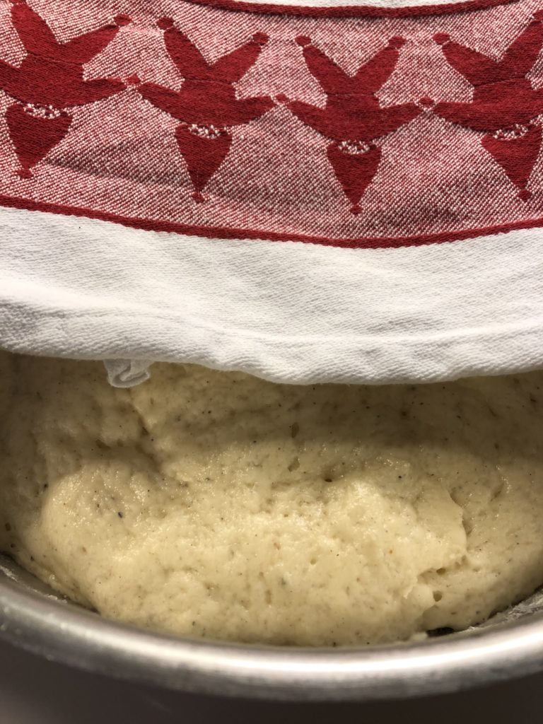 Alusta tämän jälkeen jauhot joukkoon vähitellen. Lisää lopussa myös sulatettu voi. Vaivaa taikinaa, kunnes se irtoaa kulhon reunoista. Lisää tarpeen vaatiessa hieman vielä jauhoja. Kohota taikina liinan alla kaksinkertaiseksi, vaikka kylmässä uunissa, jossa se saa olla rauhassa.