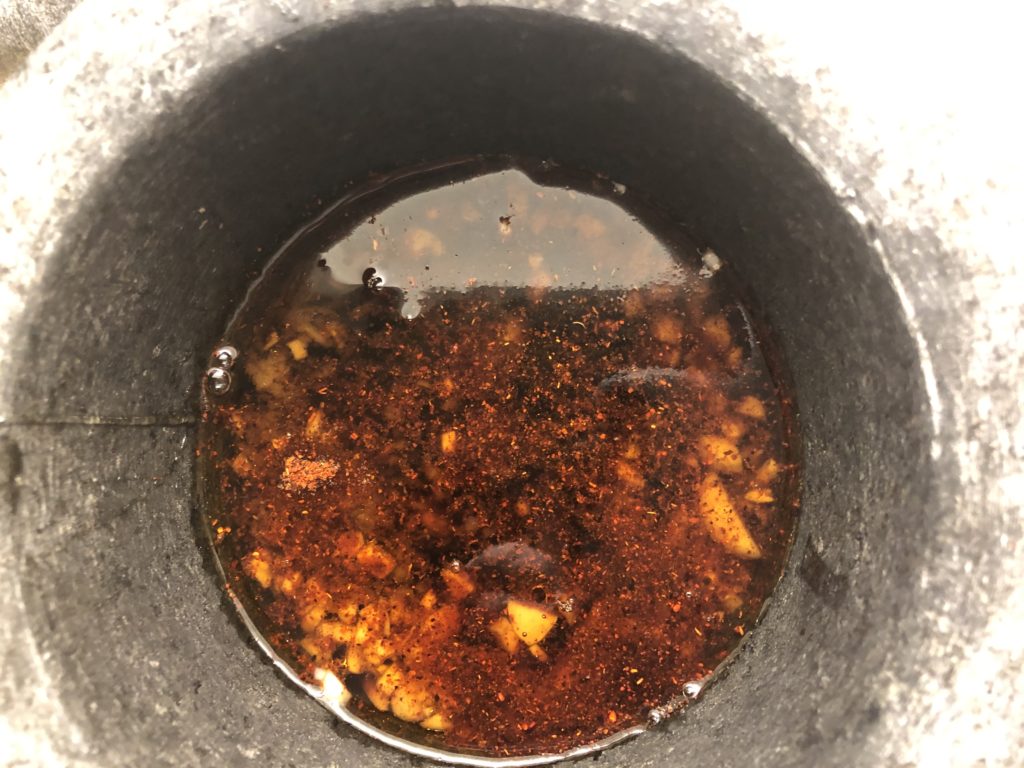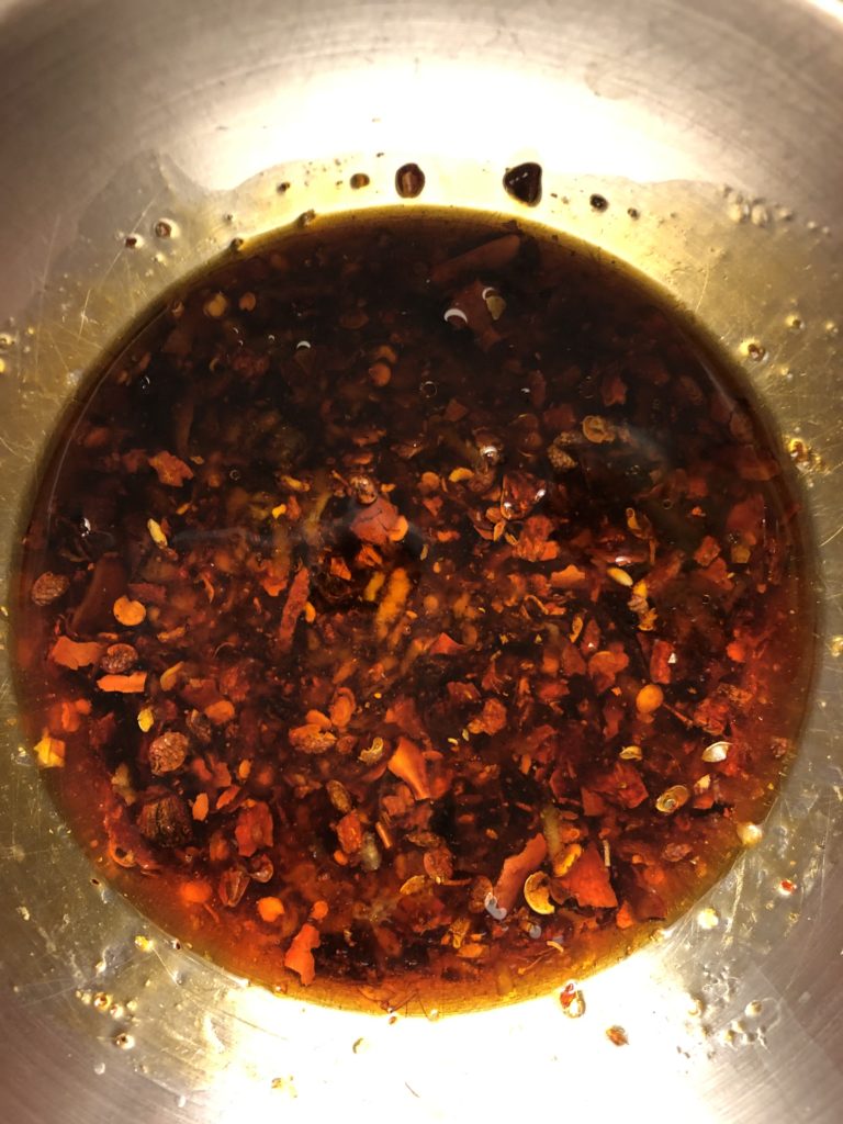 3 tl sichuanpippuriöljyä tai 3 tl seesaminöljyä ja 1/2 tl murskattuja sichuaninpippureita