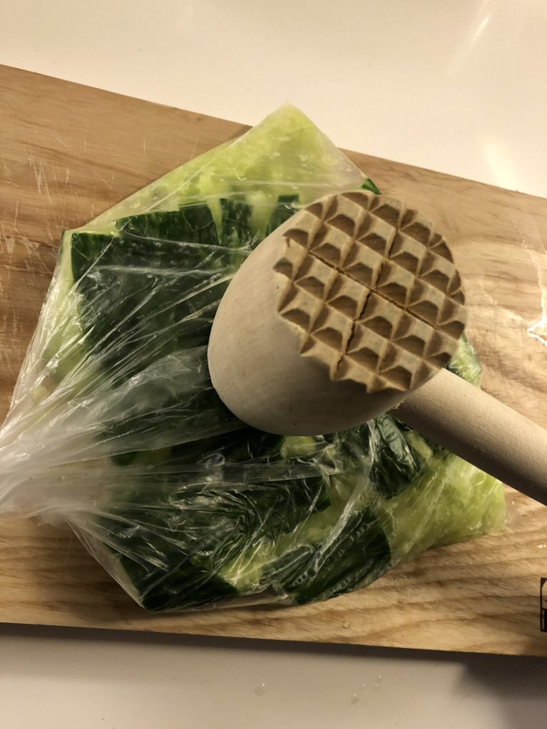 Paloittele kurkut kolmeen osaan. Laita kurkut pussiin ja mäiski niitä lihanuijalla tai vastaavalla kunnes ne ovat tuusanmuuskana.