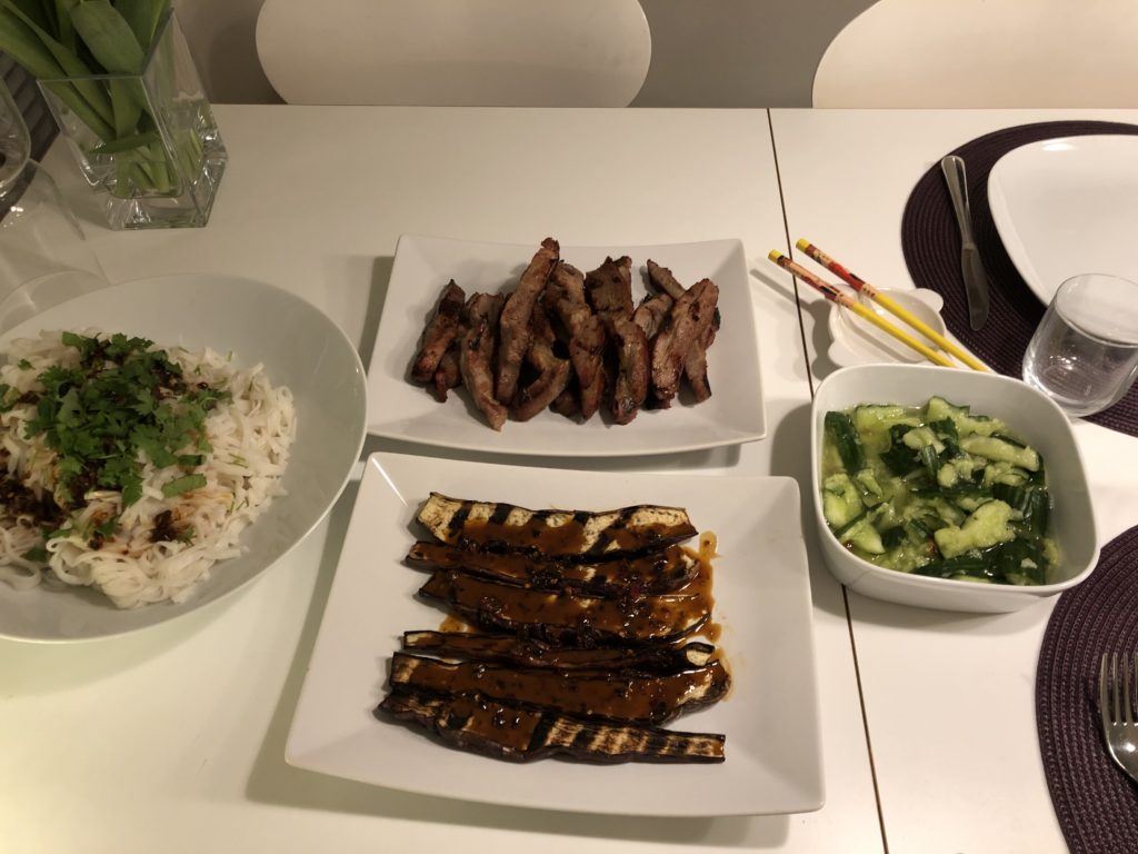 Menumme koostui mäiskitystä kurkkusaatista-kyllä, kurkku mäiskittiin lihanuijalla tuusannuuskaksi- grillatusta munakoisosta, jättikaslerpihvistä sekä nuudelisalaatista. Kaslerin laitoin marinoitumaan edellisenä iltana, koska vähimmäis marinoitumisaika on 12 tuntia. Ruoka valmistui nopeasti, koska kaikki mitä piti tehdä oli sekoittaa kastikkeet, grillata sekä keittää nuudelit. Olin varovainen uuden rapean chilitahnan kanssa, mutta ruoka ei ollut lainkaan liian tulinen. Kaikista tulisin oli itse asiassa kurkkusalaatti, johon tuli kuivattua chiliä. Se oli itse asiassa todella tulista, vaikka poistin siemenetkin. Munakoisot olivat erittäin herkullisia maapähkinäisen kastikkeen kera ja nuo Lidilin ohuet munakoisot toimivat todella hyvin, uskoisin että jopa paremmin kuin tavalliset paksut munakoisot. Ainoastaan lihan teen ensi kerralla toisin. Olen käyttänyt kassleria nyhtöpossuun, mutta ensi kerralla kun teen tätä ruokaa-javarmuudella teen uusiksi-laitan mielummin lihan porsaan sisäfileestä. Pojille laitoin nuudelia myös ilman kastiketta, mutta varsinkin esikoinen piti hieman tulisesta nuudelinkastikkeesta erittäin paljon.