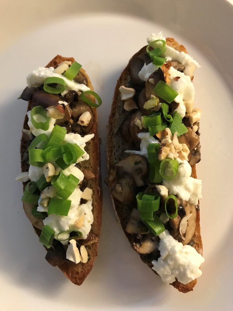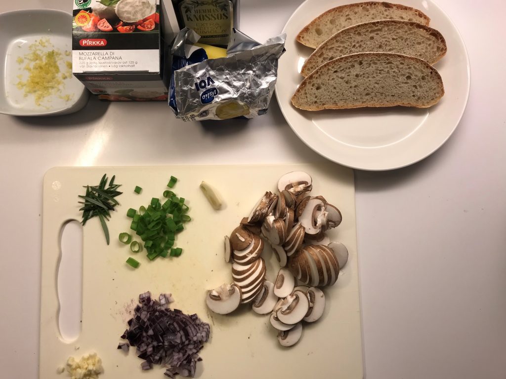 Minulle sattui Isänpäivämenun suunnittelussa jokin suunnittelukukkanen ja ostin ainekset kahteen alkuruokaan. Joten toisesta alkuruuasta tulikin sitten aikuisten välipala lauantaina ensimmäisen jäähallikierroksen jälkeen. Ohje on uusimmasta Glorian Ruoka&Viinistä (9/2018). Alkuperäisessä ohjeessa on Burrata-juustoa, sitä on kuitenkin hyvin hankala saada ja en saanut sitä paikallisesta Citymarketista, enkä K-Supermarketista, jotka muuten ovat hyvin varustettuja. Burrata tehdään mozzarellasta ja kermasta, joten korvasin sen mozzarellalla. Käytän aina, jos vain saan Bufala Mozzarellaa, itse asiassa, jos en saa, jätän ostamatta. Pirkan Parhailla on hyvä Bufala Mozzarella, samoin Lidlistä saa hyvää nimenomaan Bufala Mozzarellaa. Burrataa olisin todennäköisesti saanut uudesta Herkku Food Marketista tai Lentävästä Lehmästä, joka sijaitsee Hakaniemen hallissa. Nyt käyttämäni Pirkan Parhaiden Mozzarella toimi kuitenkin hyvin, koska en nähnyt järkeä ajaa ympäri kaupunkia juuston perässä. Muuten tein ohjeen mukaan tai no salaattisiemensekoitus oli Pirkan pähkinäsekoitus, joka toimi myös hyvin. Käytin siemenet morttelissa, koska pidän niistä murskattuina enemmän tällaisessa annoksessa. Ohjeessa oli myös eri sieni vaihtoehtoja, mutta valitsin tummat herkkusienet meille. Rosmariinin nappasin taas pakkasesta, jonne olin sen tuoreena pakastanut, kun kerralla harvoin kaikki menee. Ja ruohosipulin korvasin kevätsipulilla, koska sitä sattui olemaan valmiina jääkaapissa.
