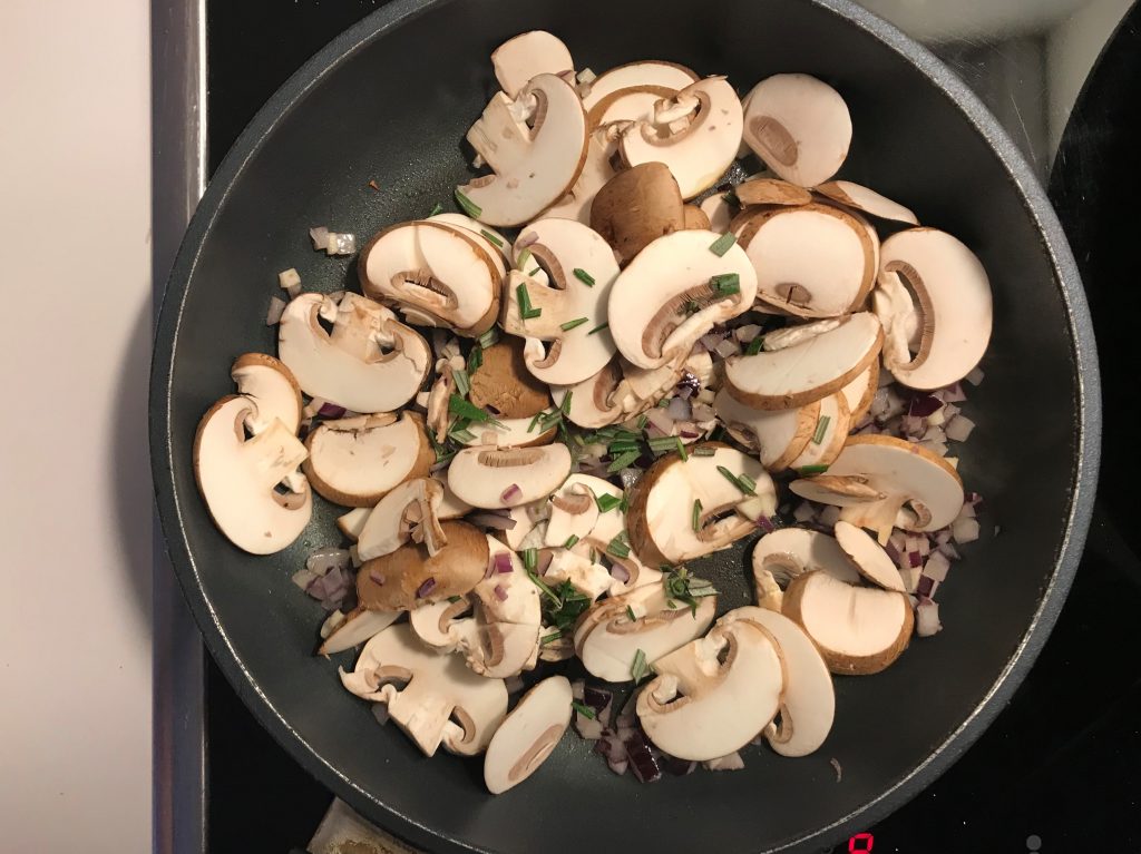 Puhdista sienet ja paloittele ne. Kuori ja hienonna sipulit. Kuumenna pannu ja lisää öljy. Paista sipuleita hetki, lisää sienet ja rosmariini, paista lisää. Lisää voi ja anna sulaa, mausta suolalla, pippurilla, sitruunankuorella ja pidä lämpimänä.