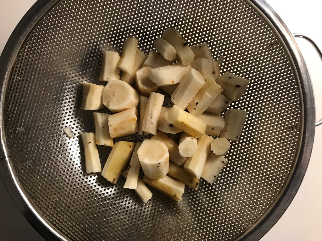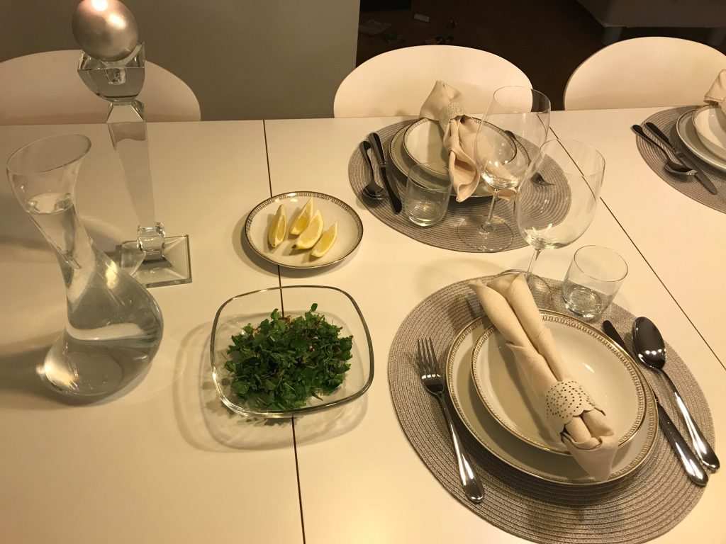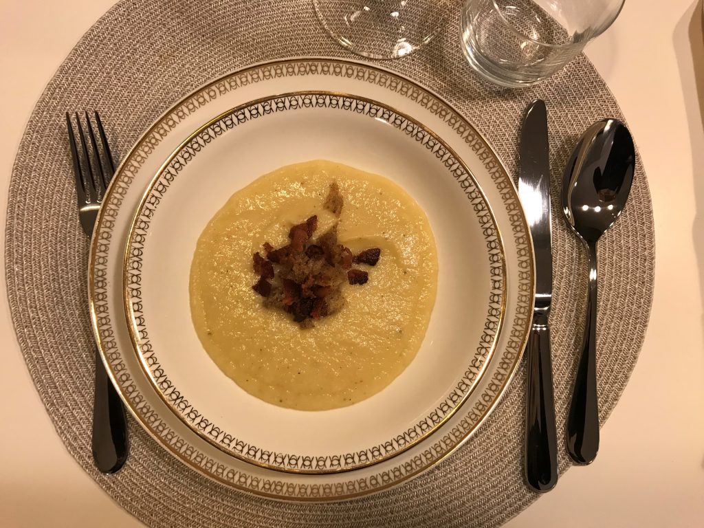 Juhlistimme Isänpäivää ruuan merkeissä jo lauantaina, koska sunnuntai on lätkän puolesta niin hektinen, ettei pitkälle ruokailulle jää kunnolla aikaa. Tein alkuruuaksi mustajuurikeittoa. Mustajuuri on todella hyvä, esimerkiksi juuri keitossa, mutta silti harvemmin tulee sitä käytettyä. Juuret ovat melko multaiset ja suosittelen heittämään ne jo kaupassa johonkin pussiin, muuten multaa on ihan joka paikassa. Keittoa vahvisti tällä kertaa pekoni, koska pancettaa en niin saanut niin Citymarketista kuin K-Supermarketistakaan. Sama juttu siis kuin Burratan kanssa. Mutta pekoni toimi silti ihan hyvin. Lisäksi paahdoin päälle myös leivänmuruja. Ohje on myös uusimmasta Glorian Ruoka&Viini lehdestä (09/2018). Kuopus ei keitosta liiemmin innostunut, mutta esikoinen söi hänenkin lautasellisensa. Tein keittoa puolikkaan annoksen Glorian Ruoka&Viini ohjeesta, koska mustajuurta myydään 500g pakkauksessa, enkä ollut kirjoittanut ostoslistaan kuin ”mustajuuri”. Katoin pöytään miehen perintöastiat, koska oli juhlan aika. Tiesi tosin käsitiskiä ruuan jälkeen, kun lautasissa on kultareunukset, mutta menköön tuo sitten iltapuhteena.