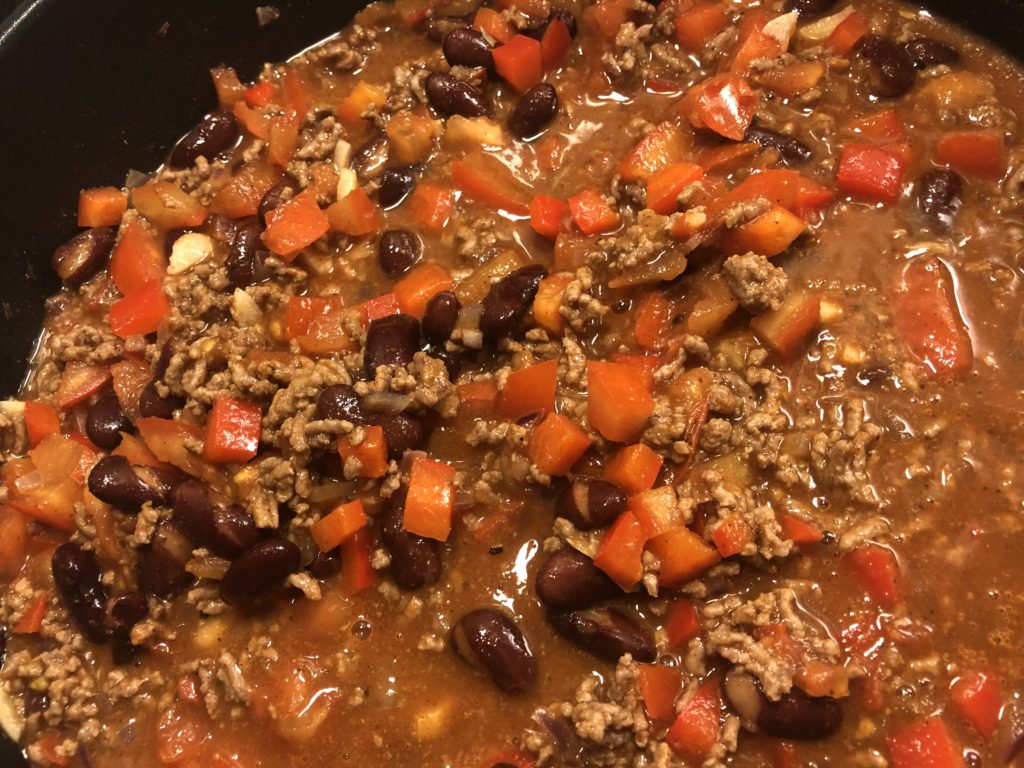 Kuori ja silppua sipulit. Huuhtele ja valuta kidneypavut. Pese ja kuutioi paprika. Poista tomaateista kannat ja halutessasi myös siemenet ja kuutioi. Kuumenna öljy padassa kuullota sipulit. Lisää jauheliha ja ruskista kypsäksi. Lisää paprika ja tomaatit ja kuullota hetki. Lisää kidneypavut ja mauste, tomaattimehu ja sokeri. Hauduta kannen alla 20 minuuttia matalalla lämmöllä. Tarkista maku ja lisää silputtu basilika.