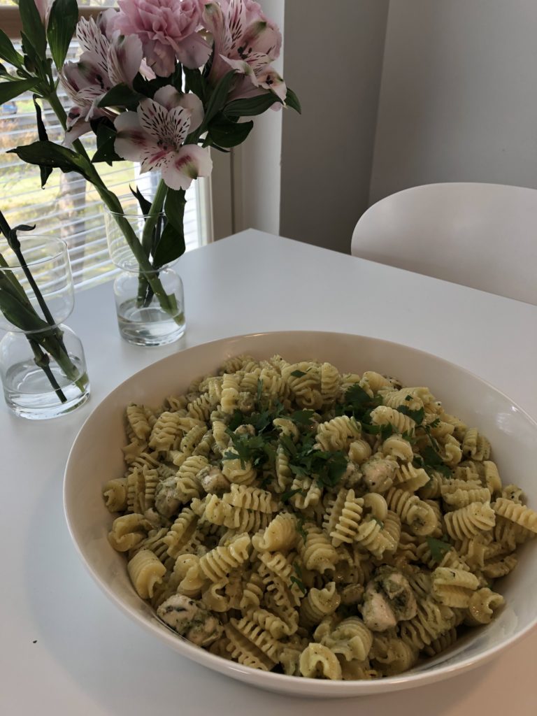 Etsin broileripastan ohjetta ja tämä tuli vastaan Soppa365 sivulla. Ohje on alunperin MeNaisista. Tämän pastan kaikki ainekset puhuttelivat minua ja varsinkin korianteripesto kuulosti kokeilemisen arvoiselta. Pidin myös siitä, että pasta on raikastettu tuoreella sitruunamehulla. Myös pasta keitetään sitruunakuoriraasteen kera ja sitäkään en ollut ennen kokeillut.