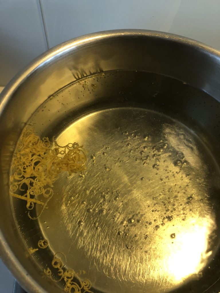 Raasta sitruunan kuori ja purista mehu. Kuumenna vesi isossa kattilassa ja lisää kuoriraaste ja suola.