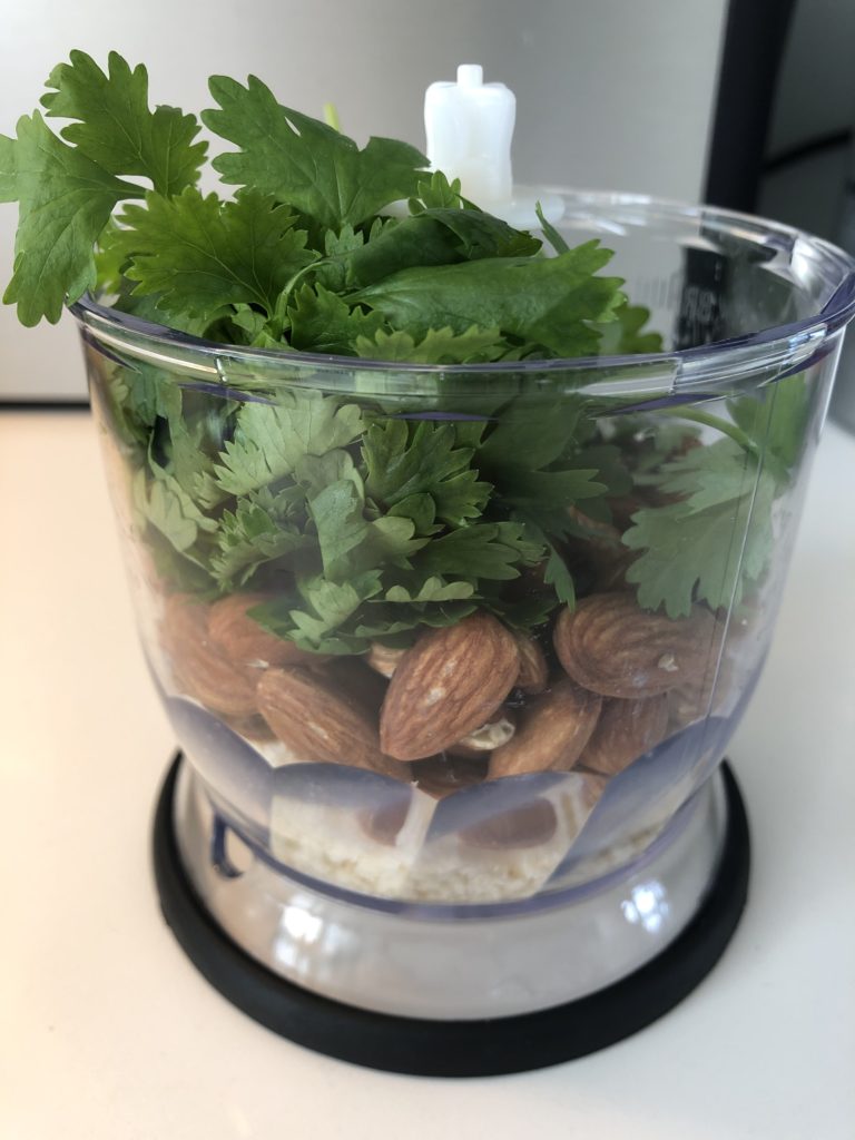 Valmista ensin pesto. Laita kaikki ainekset tehosekoittimeen tai käytä sauvasekointinta. Aja pesto valmiiksi. Lisää öljyä tarvittaessa.