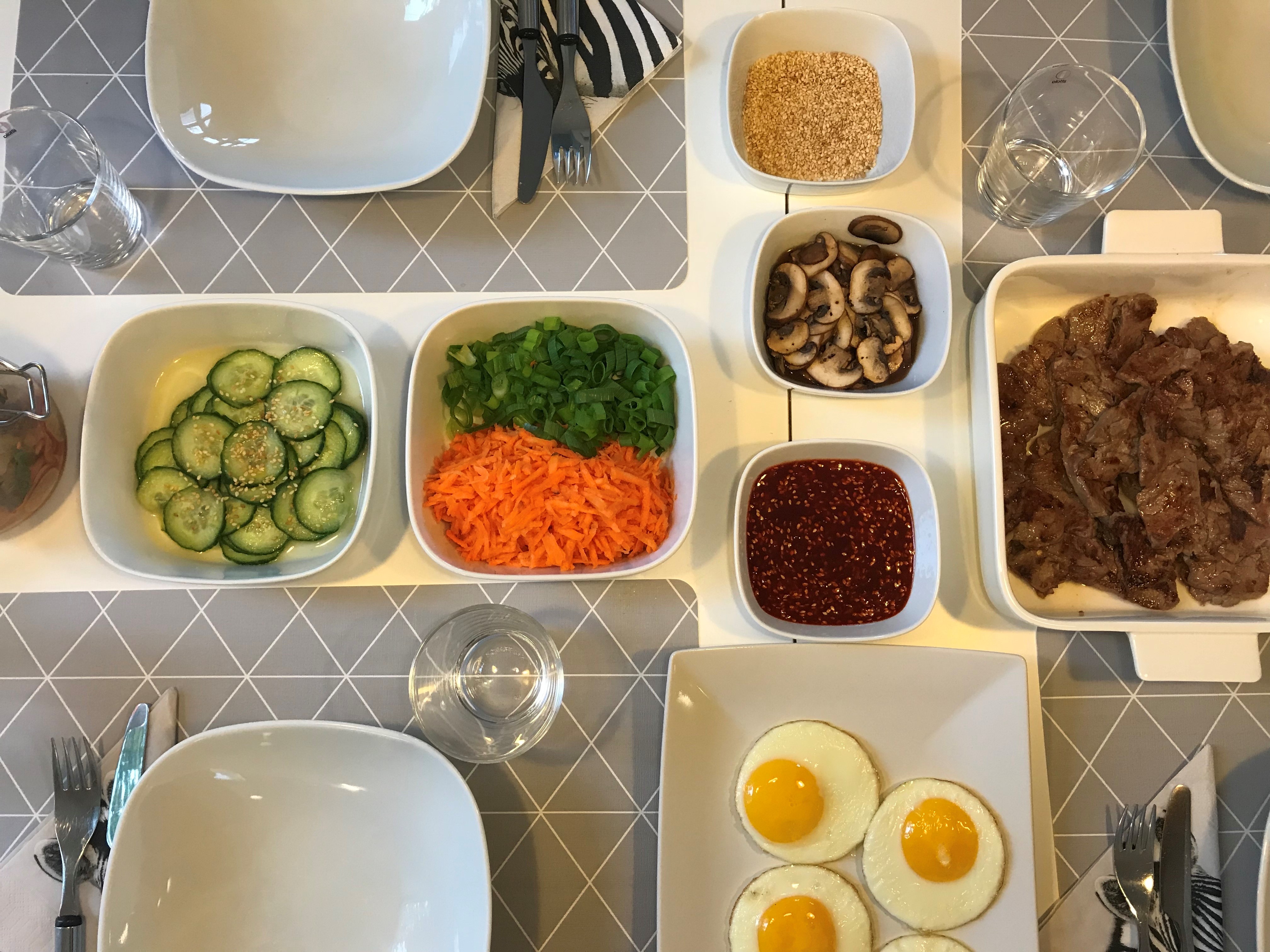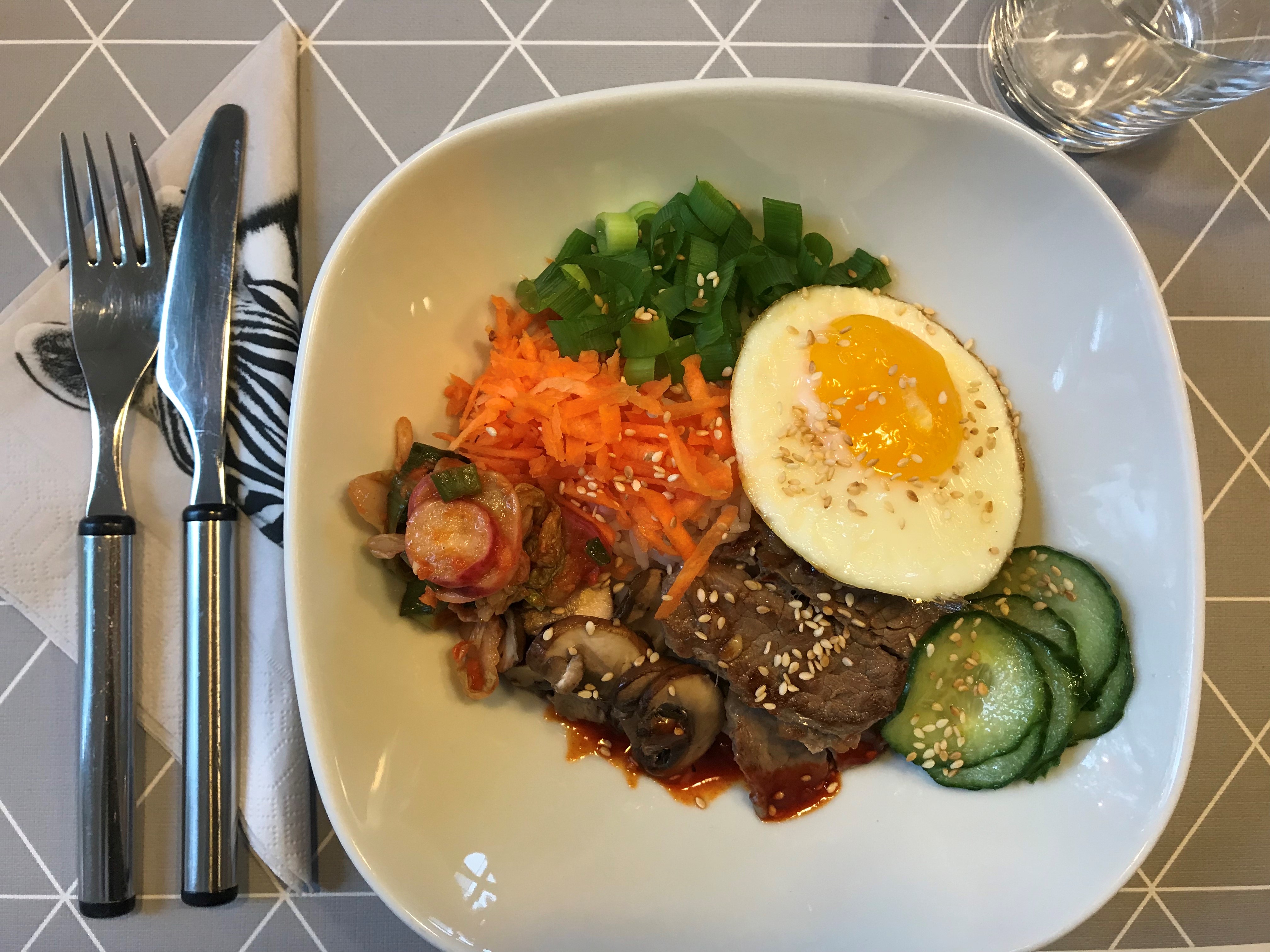 Viikonloppuisin on aikaa tehdä paremmin ruokaa ja vaikka suurin osa viikonlopusta kuluukin jäähallilla poikien lätkätreeneissä ja myös autossa, koska välimatkat ovat pitkät, nautin silti ruuan teosta ja rentoudun misaamalla. Tapansa kullakin 😉 Tämän korealaisen Bibimbapin löysin Glorian ruoka & viini lehdestä, joka on tällä hetkellä ainut ruokalehti, joka minulle tulee. Aasialaiset maut puhuttelevat koko perhettämme, myös poikia. Ja koska kyseessä on ns bowl ruoka, laitoin kaikki ainekset erikseen tarjolle ja pojat saivat laittaa annokseensa kaikki ne, jotka maistuivat itselle hyvältä, tosin esikoinen laittoi taas kaikki. Hän on nyt 11-vuotiaana jo hyvin rohkea maistelija ja utelias uusiin makuihin. 8-vuotias tulee perässä omaan tahtiinsa, en pakota juurikaan maistamaan, koska itse muistan edelleen hyvin, kun lapsena minulle oli piilotettu voileipään juuston alle inhoamaani maksamakkaraa. Sen jälkeen en ole sitä syönyt, enkä syö eli ei toiminut!