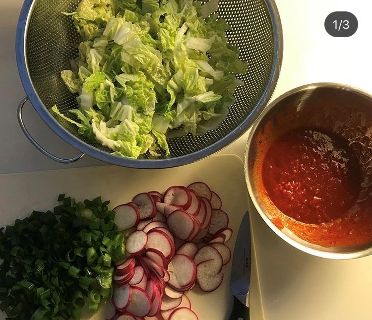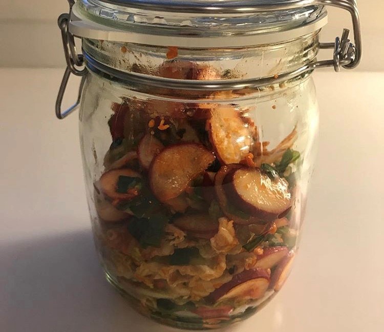 Suikaloi kaali, sekoita joukkoon suola ja anna maustua tunti. Huuhtele kaali kylmän veden alla ja kuivaa huolella. Kuori ja paloittele valkosipulinkynnet ja inkivääri ohuiksi lastuiksi kulhoon. Lisää etikka, kalakastike, gochujang ja sokeri. Sekoita sauvasekoittimella tasaiseksi. Sekoita tahna kaalin joukkoon. Viipaloi retiisit. Seuraavalla kerralla myös puolitan retiisit viipaloinnin jälkeen, paremmin suun kokoisia paloja, suosittelen siis. Hienonna kevätsipuli ja lisää retiisit ja kevätsipuli kaalin joukkoon. Lusikoi purkkiin ja anna fermentoitua vuorokauden ajan huoneenlämmössä. Säilyy jääkaapissa 3 viikkoa. Voit myös tarjota ilman fermentointia, jos et pysty tekemään kimchiä vuorokautta ennen.