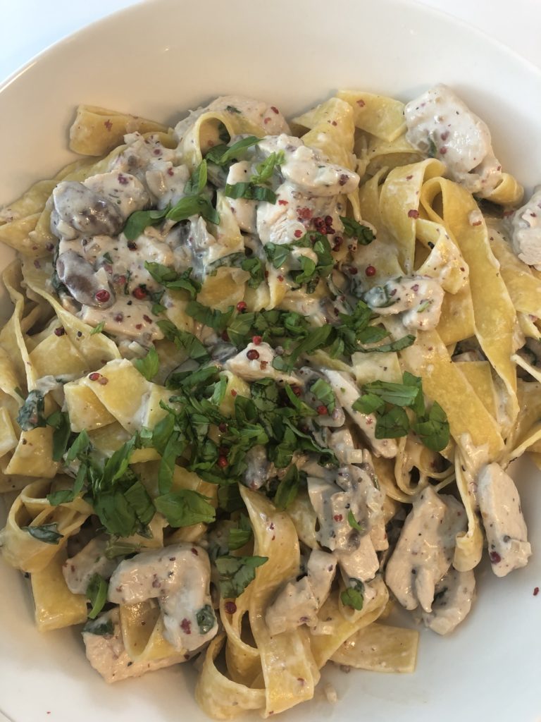 Silppua sipuli ja suikaloi herkkusienet. Paista ensin sipuleita ja lisää sitten herkkusienet. Anna sipulien kuullottua, ei ruskistua. Siirrä sipulit ja herkkusienet toiseen astiaan odottamaan. Leikkaa broileri suupaloiksi ja paista kypsiksi ja mausta kevyesti suolalla ja mustapippurilla. Lisää sienet ja sipulit pannuun. Lisää vehnäjauhot ja sekoita. Lisää neste. Anna kiehahtaa. Keitä pasta. Lisää lopuksi tuorejuusto ja sekoita kastike tasaiseksi juuston sulatessa. Lisää murskatut (käsin tai morttelissa) rosepippurit joukkoon ja sekoita. Lisää basilika. Lisää keitetty ja valutettu pasta kastikkeen joukkoon ja sekoita kunnolla.