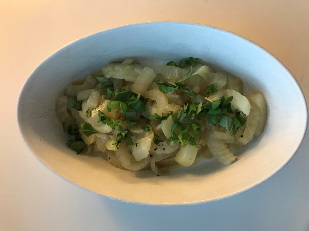 Pese fenkolit ja leikkaa ne noin sentin paksuiksi suikaleiksi. Kuumenna öljy kattilassa, lisää fenkolisuikaleet ja anna fenkolien hieman ruskistua eli paista noin 3 minuuttia. Lisää kasvisliemi, peitä kannella ja hauduta miedolla lämmöllä 15 minuuttia. Lisää suola, mustapippuri ja basilika.