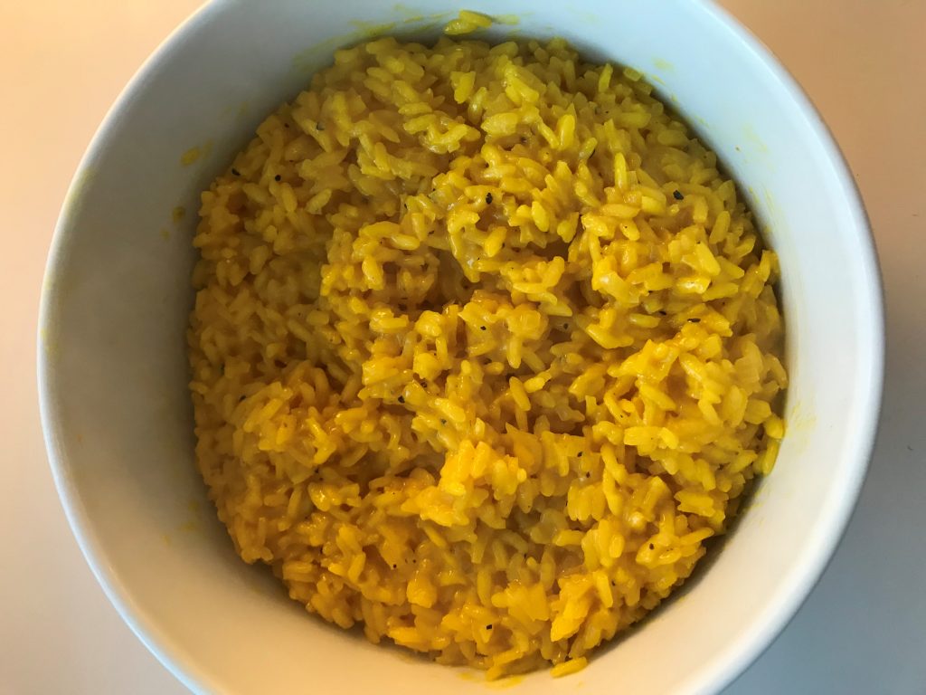 Kuullota sipulit voi-öljyseoksessa. Lisää riisit ja kuullota. Lisää viini ja anna sen imeytyä ja haihtua. Sekoittele koko ajan. Lisää sahrami. Lisää kanalientä kauhallinen kerrallaan, odota sen imeytymistä ja lisää seuraava kauhallinen, sekoittele välillä. Kun risotto on al dente, se on valmista, maistele siis välillä. Lisää raastettu parmesaani, mustapippuri ja tarpeen vaatiessa suolaa. Valmistukseen kuluu noin 20 minuuttia. Tarjoa heti.