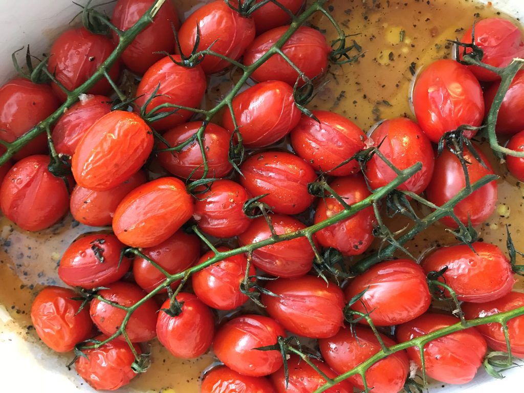 Huuhtele tomaattitertut, valuta ja nosta voideltuun uunivuokaan. Sekoita kastikkeen ainekset keskenään ja valuta tomaattien päälle. Paahda 200C uunissa noin 20 minuuttia.