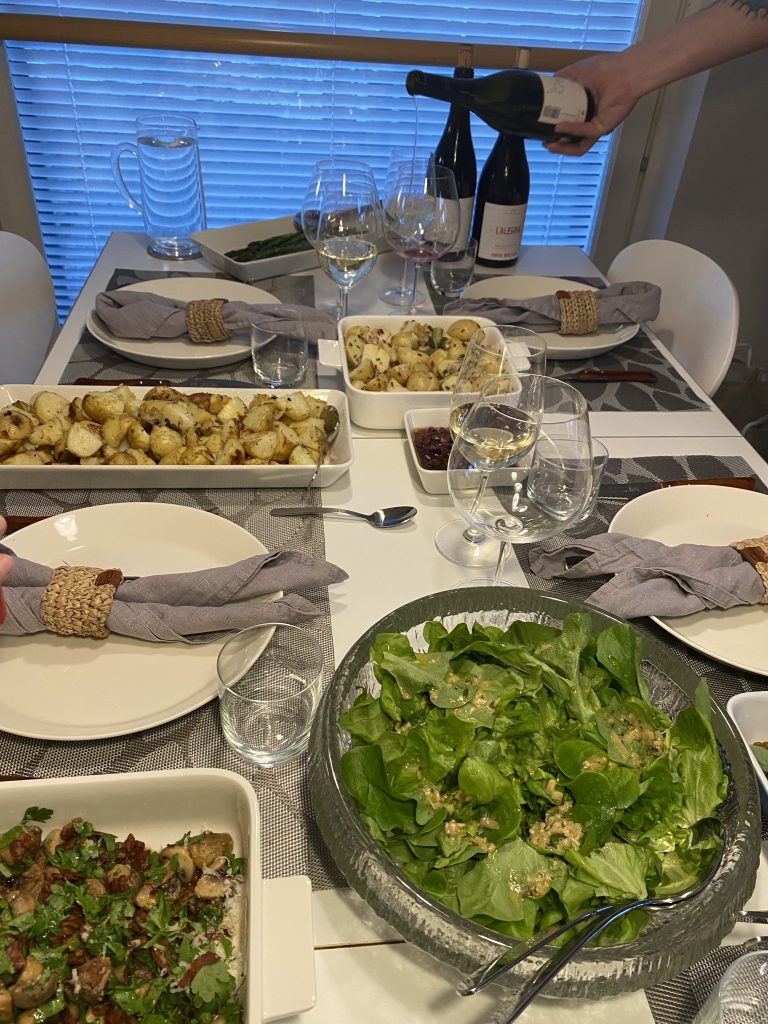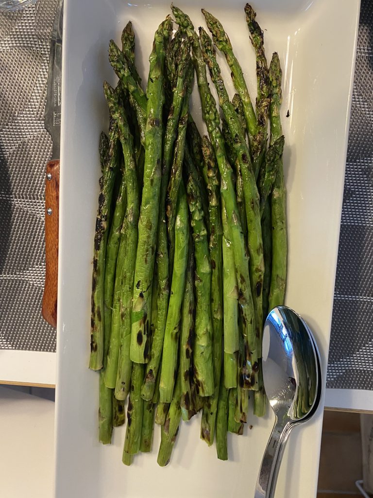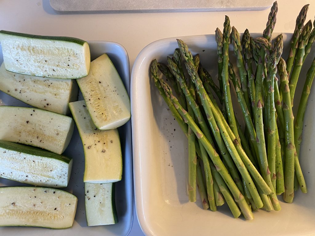 Lihan lisäksi tein uusia perunoita kahdella tapaa, salaattina sekä grillin kautta käyneenä keittämisen jälkeen. Lisäksi löytämäni ohje kesäkurpitoista ja varsinkin niiden mangokastikkeesta kuullosti niin hyvältä, että se pääsi kokeiluun myös. Neljäntenä lisukkeena minulla oli ei-niin-kevyitä, mutta ah niin herkullisia herkkusieniä pekonin ja parmesanin kera. Lisäksi grillasimme loput parsat myös ja tarjosin ne aivan sellaisenaan-tosin oliiviöljyllä siveltyinä ja suolalla ja pippurilla maustettuina. Kaikki ohjeet on poimittu kahdesta grillauskirjasta: ”Nyt grillataan, 101 mahtavaa grilliruokaa” ja ”Suuri grillauskirja.