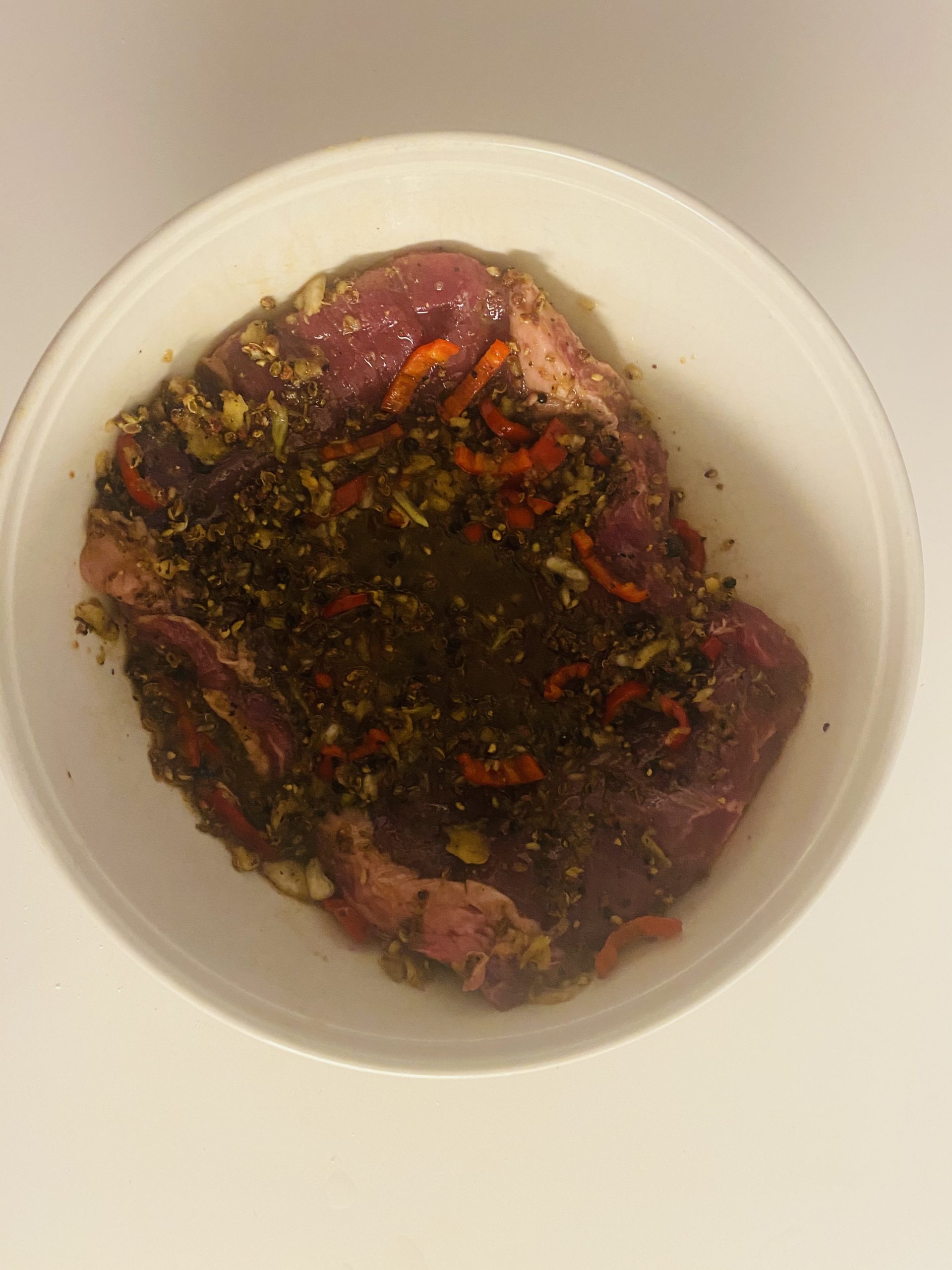 Murskaa valkosipuli ja suola huhmareessa. Lisää pippurit, sokeri ja chili ja työstä tahnaksi. Lisää soija ja limetin mehu. Laita lihat astiaan ja taputtele tahna niiden päälle. Suojaa astia kelmulla ja anna marinoitua mieluiten yön yli.