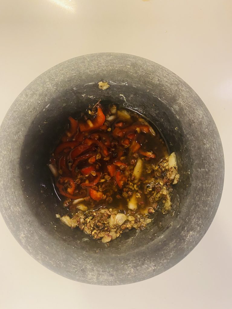 1 punainen chili siemenet poistettuna ja pieneksi silputtuna