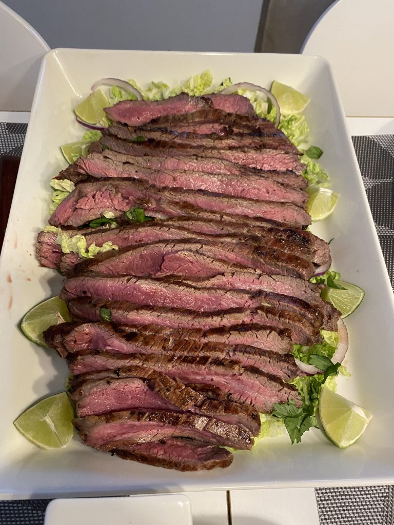Ota liha pois marinadista ja pyyhi mahdolliset kiinteät mausteet pois pinnasta. Sivele pintaan kevyesti öljyä ja grillaa oman makusi mukaan kypsäksi, noin 3-4 minuuttia per puoli. Suikaloi liha ohueksi ja nosta suikaleet kiinankaali salaatin päälle. Koristele limetin lohkoilla.