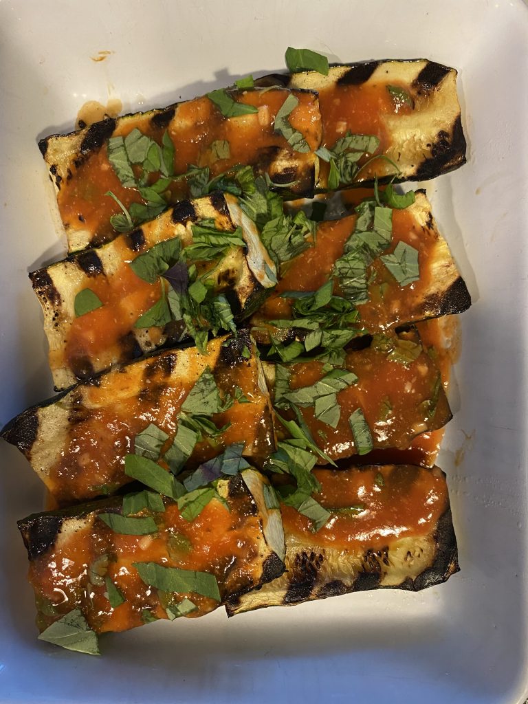 Yhdistä kastikkeen ainekset ja sekoita hyvin. Sivele kesäkurpitsat seesaminöljyllä molemmin puolin ja ripottele niille reilusti suolaa ja mustapippuria. Grillaa kesäkurpitsoja 3-4 minuuttia per puoli, kunnes ne ovat kosteita ja sisäpinta on läpikuultava. Asettele kesäkurpitsat tarjoiluvadille ja tarjoa kastike erikseen tai kaada kesäkurpitsojen päälle. Koristele lopuksi vielä ylijääneillä (thai)basilikan lehdillä.