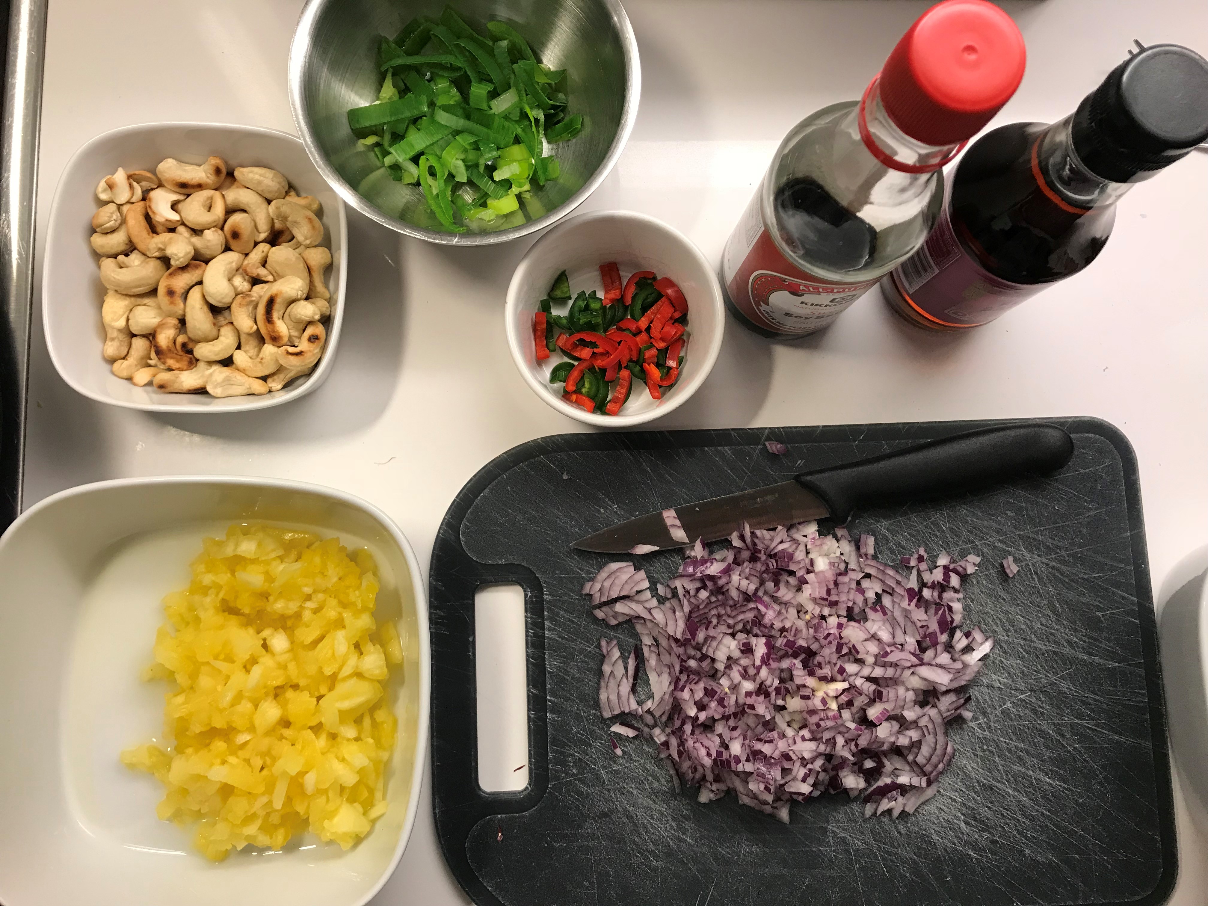 Keitä riisi pakkauksen ohjeen mukaan ja valuta. Kuumenna öljy wokissa tai kasarissa ja kuullota siinä sipuli ja chilit pehmeiksi, 3-5 minuuttia. Lisää riisi ja sekoita hyvin. Sekoita joukkoon ananas, broileri, cashew pähkinät ja kevätsipuli. Mausta seos kala- ja soijakastikkeella. Lusikoi riisi ananaksen puolikkaisiin. Koristele suikaloiduilla mintunlehdillä ja chilirenkailla. Tarjoa lisänä soijaa.