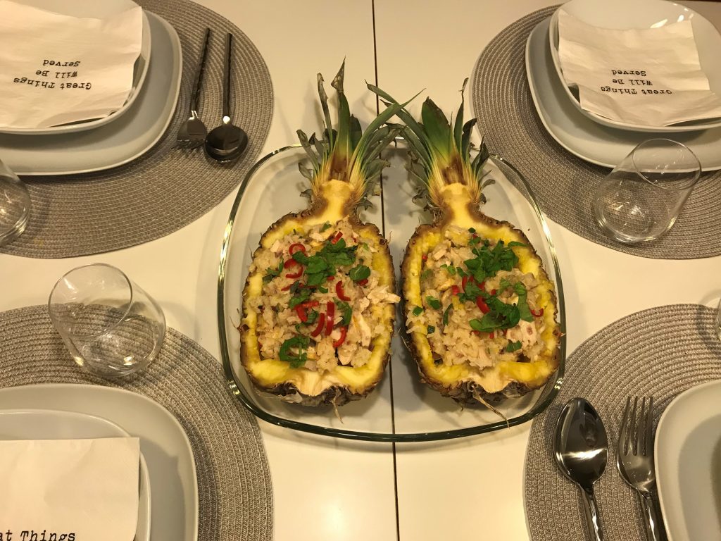 Viikonloppuisin tekee mieli kokeilla uusia ruokia, vaikka lätkää mahtuukin viikonloppuihin useampi tunti. Minulla on Klassisen Thaikeittiön kirja ja olen pitkään halunnut kokeilla tätä reseptiä. Nyt päätin viimein kokeilla ja kyllä kannatti, hyvää tuli ja kaunista myös. Ananaksen puolikas on näyttävä tarjoiluastia, mutta silti hyvin helppo tehdä. Olen vuosien saatossa ostanut pikkuhiljaa laadukkaita keittiötarvikkeita lisää. Yksi parhaimmista on kunnon japanilainen kokkiveitsi. Ostin sen Chez Mariuksesta pari vuotta sitten. Ja sillä käy vaivattomasti kaikki leikkaaminen, myös tämä ananas. Kunnon työkalut lisäävät kokkaamisen nautintoa, suosittelen panostamaan niihin. Tässä ohjeessa on miedot mausteet chiliä lukuunottamatta, joten se maistui pojillekin. Jätin chilit tarkoituksella melko isoiksi, jotta kuopus saa halutessaan poimia ne pois annoksestaan. Esikoinen syö chiliä ihan mielellään jo. Ohjeessa oli riisin lisäksi 225 g laihaa sianlihaa (mitä se ikinä tarkoittaakaan?) sekä 115 g kuorittuja jättirapuja, mutta koska halusin ruuan kelpaavan myös pojille, korvasin nämä tällä kertaa grillatulla broilerilla. Ja halusin laittaa nimenomaan kaupassa grillattua broileria, jotta saan ruokaan paistettua makua enemmän. Lopun ananaksen syömme sunnuntaina aamiaisena.