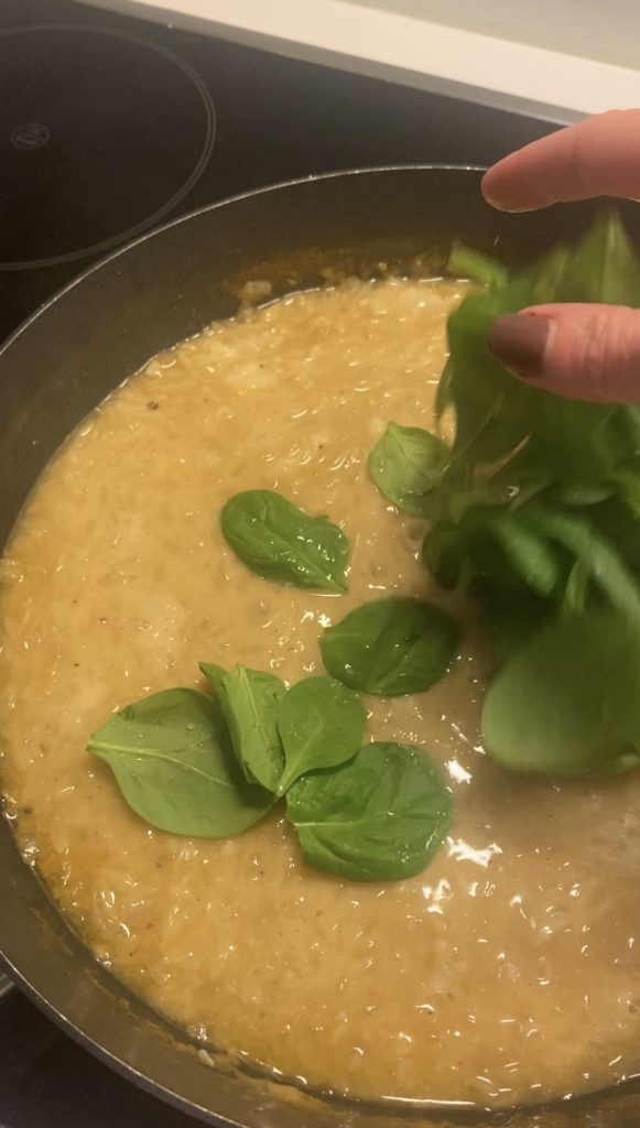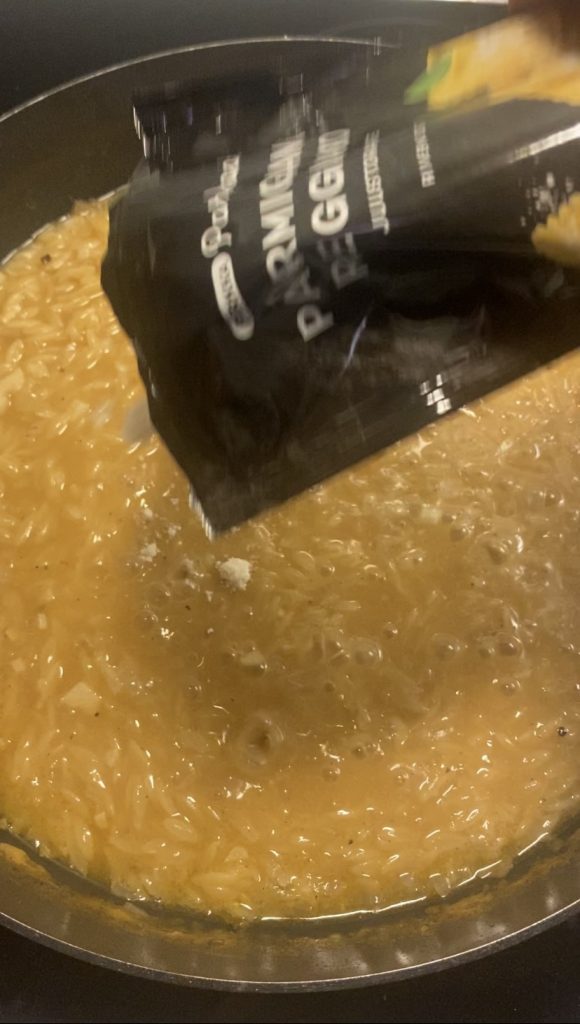 Lisää seuraavaksi valmis tai valmiiksi keitetty kanaliemi pannulle ja sekoita. Anna orzon kypsyä miedolla lämmöllä välillä sekoittaen 10-15 minuuttia. Orzon pitää olla pehmeää kunnes se on valmista, lisää tarvittaessa kanalientä. Kun orzo kypsää, lisää parmesaani ja pinaatit sen joukkoon.