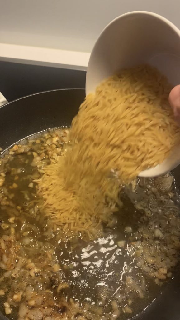 Lisää pannulle valkoviini ja sitruunan mehu, anna kiehahtaa. Lisää orzo pannulle ja sekoita.