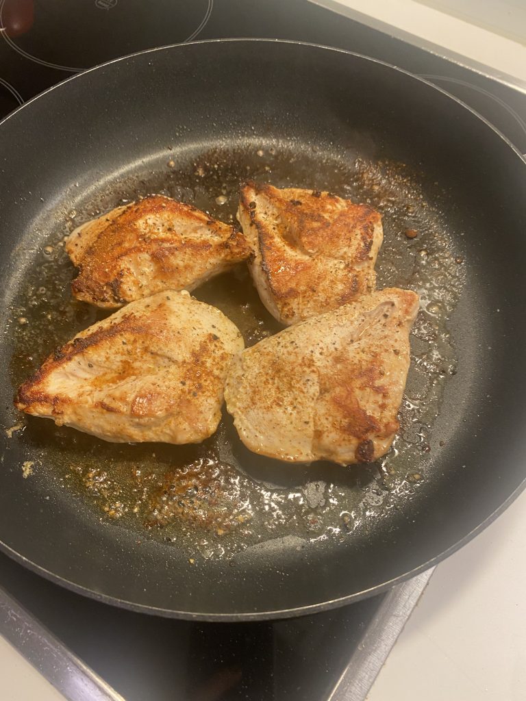 Sulata voi-oliiviöljyseos pannulla ja paista broilereita noin 8 minuuttia per puoli. Nosta broilerit paistamisen jälkeen syrjään ja pidä lämpiminä. Jos epäilet, ettet saanut niitä kypsäksi, laita uuni päälle 200C ja paista niitä hetki juuri ennen kuin orzo on valmista.