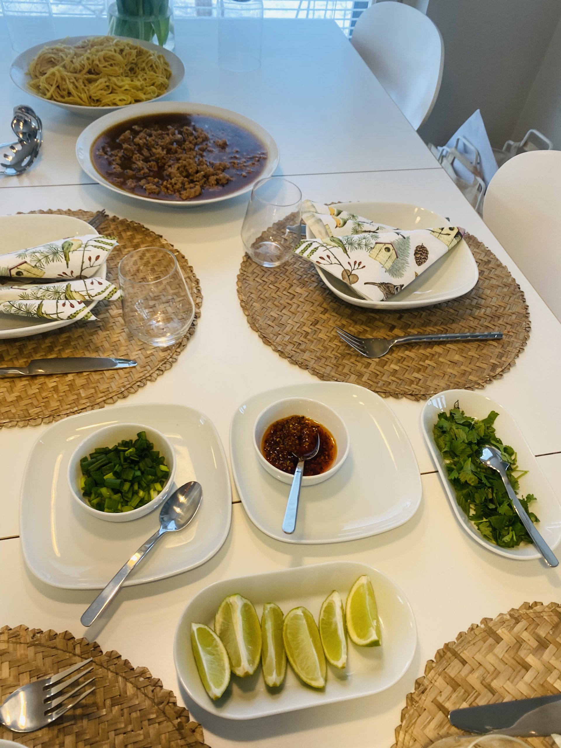 Laita ainekset tarjoiluastioihin tai kokoa valmis annos. Pohjalle nuudelia, päälle jauhelihakastike ja koristele kevätsipulilla, korianterilla ja runsaalla määrällä rapeaa valkosipulia. Purista lopuksi limettiä päälle! Tarjoa heti!