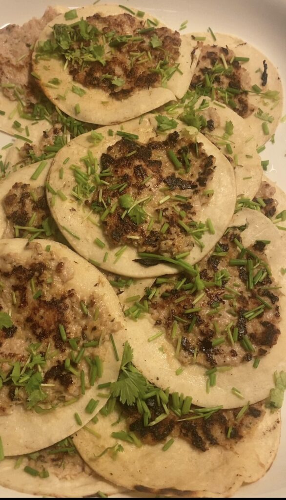 Löysin tämän ohjeen Instagramista ja tallensin reelsin puhelimeeni valmiiksi hetkeen, jolloin tulee tarve saada nopeasti hyvää ilapalaa. Se tuli vastaan nopeammin kuin aavistinkaan ja eräänä kesäkuun iltana valmistin nämä, kun kaikilla oli nälkä, mutta mitään suurempaan ei ollut tarvetta. Näissä tulee sekoittaa vain mausteeet broilerin/kanan jauhelihaan ja sitten taputella ohut kerros lihaa pieniin tacolettuihin. Käytiin niin pieniä tacolettuja, että niitä mahtui paistinpannulle neljä yhtä aikaa. Kerroksen tulee olla tosi ohut, jotta broilerin/kanan jauheliha kypsyy varmasti. Valmiit laitoin tarjoiluastiaan ja folion päälle, että ne pysyivät lämpiminä. Lopulta koristelin kaikki yhtäaikaa ja tarjosin soijakastikkeen kanssa. Osa halusi mausteeksi myös sweet-chilikastiketta. Tästä annoksesta tulee noin 12 pientä tacolättyä.
