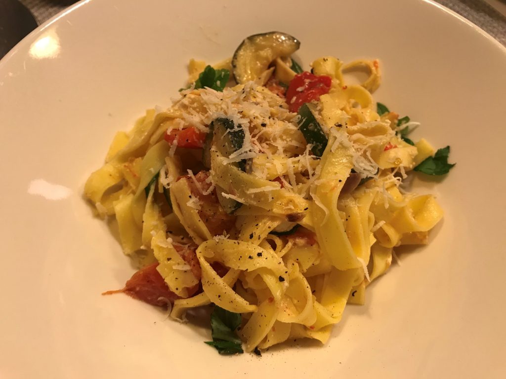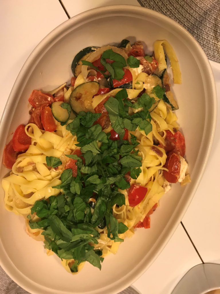 Sain tiistaina vieraakseni Helsinkiin opiskelemaan muuttaneen kummityttöni. Ja siinä samalla kun juttelimme opiskeluista, Helsingissä asumisesta, ensi vuoden suunnitelmista ja kesätöistä, valmistin hänelle kasvistagliatellen. Pojat olivat jo aikaisemmin syöneet kreikkalaisia lihapullia, joten tämä pasta tehtiin täysin aikuisten ehdoilla ja kasviksia sekä fetaa oli reippaasti. Fetaa olisi saanut olla vieläkin enemmän, joten suosittelen laittamaan koko 200g, kuten ohjeessa lukee, eikä puolikasta, kuten itse tein.