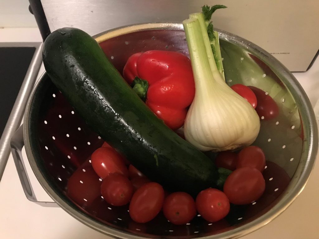 Pane keitinvesi pastaa varten kuumenemaan. Hienonna valkosipuli ja sipuli. Halkaise fenkoli, poista kanta ja leikkaa ohuiksi suikaleiksi. Poista paprikasta siemenet ja kanta ja leikkaa pieniksi suupaloiksi. Halkaise kesäkurpitsa ja leikkaa puolikkaat noin 1 cm viipaleiksi. Leikkaa tomaatit kookkaiksi kuutioiksi tai puolita kirsikkatomaatit.