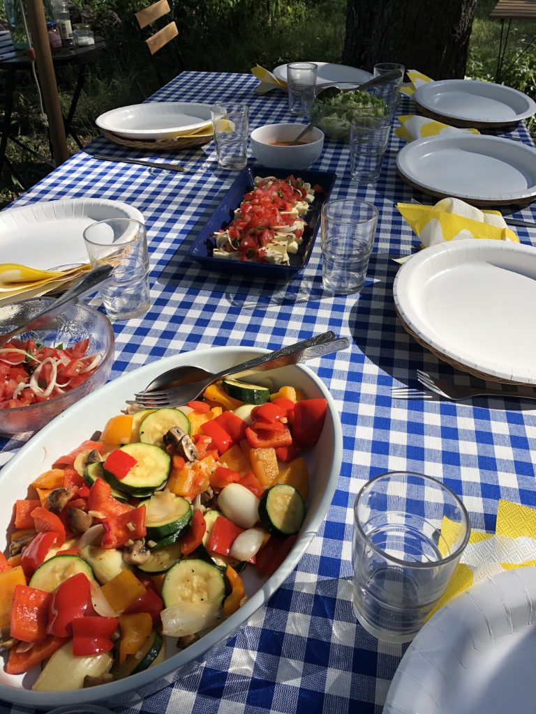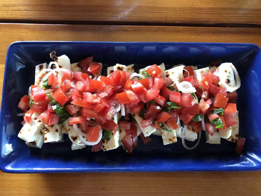 Lisäksi meillä oli pöydässä leipäjuustoa tomaattihakkeluksella, wokattuja vihanneksia sekä porsaan kanssa myös nopeasti paistettuja papuja valkosipulissa.