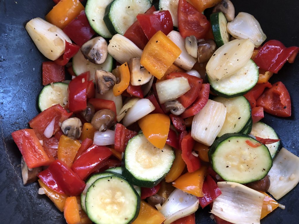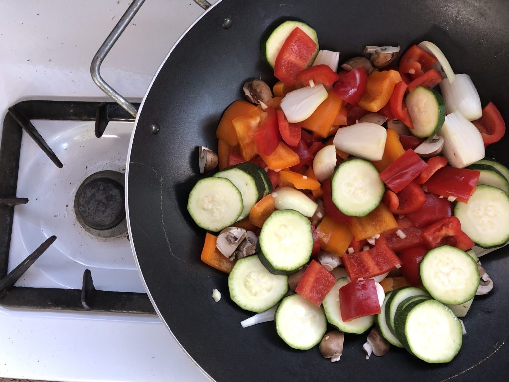 Laita oliiviöljyä wokkipannuun ja kaada kaikki kasvikset pannulle. Wokkaa kasvikset, mutta jätä ne napakoiksi.