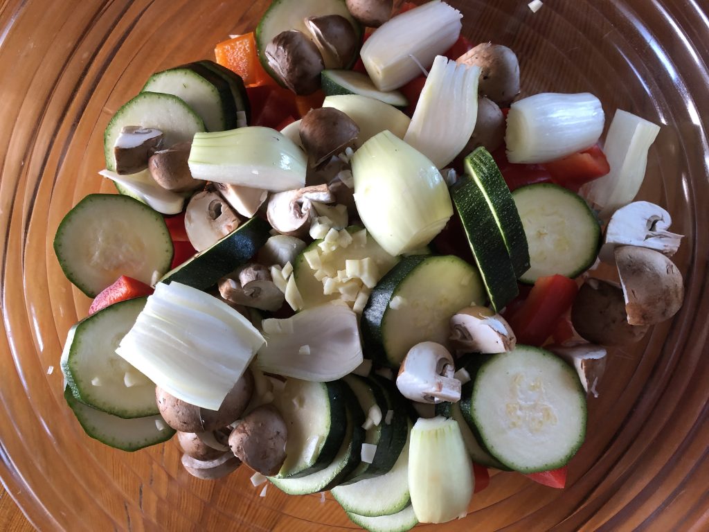 Putsaa ja halkaise sienet neljään osaan. Kuutioi paprikat. Ja leikkaa kesäkurpista siivuiksi. Leikkaa sipulit noin neljään osaan, jotta niistä tulee sopivia suupaloja. Silppua valkosipuli.