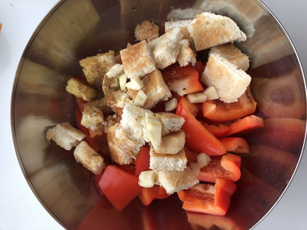 Halkaise paprikat ja chili. Poista siemenet ja kuutioi. Kuutioi myös leipä ja kuoritut valkosipulinkynnet. Laita kaikki ainekset monitoimikoneeseen ja aja tasaiseksi kastikkeeksi.